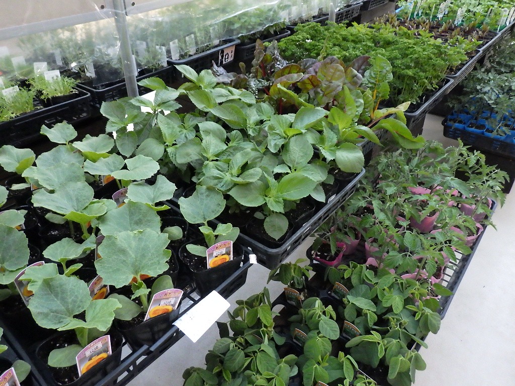 かぼちゃ苗、えだまめ苗、青じそ苗が並ぶ