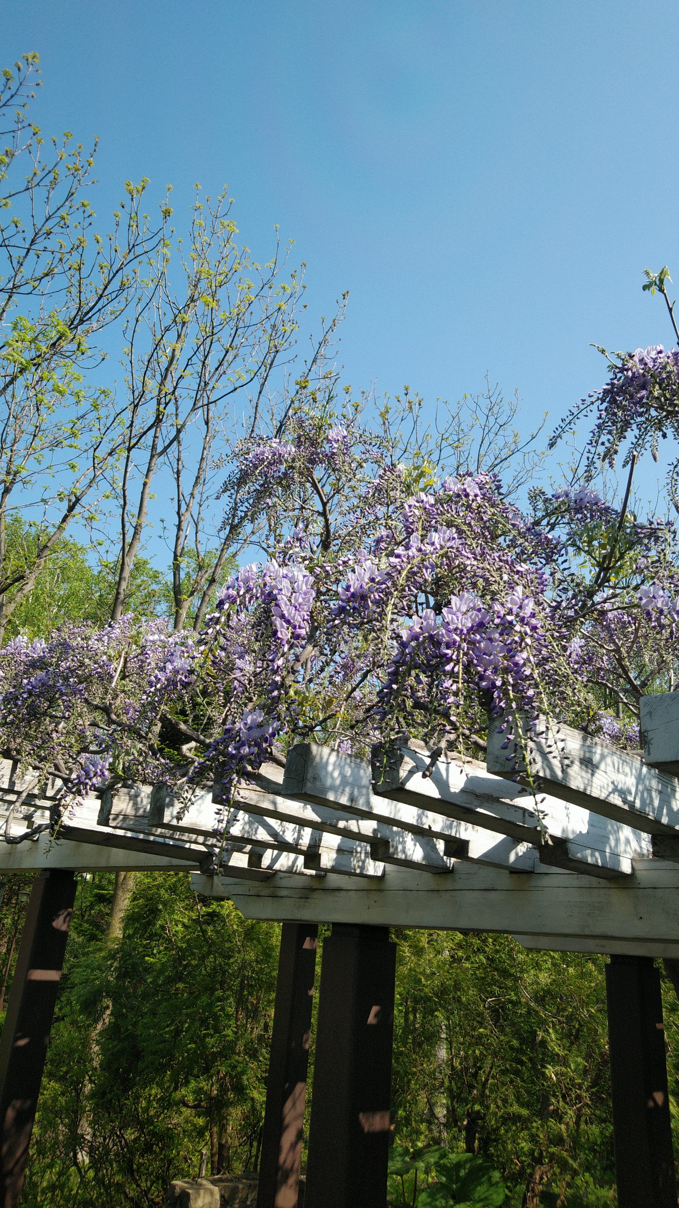 上の写真はお天気の良かった一昨日の写真で、今日はもっと房も大きくたくさん咲いていますが、青空と遠くの木々の新芽とのコントラストが綺麗だったので。