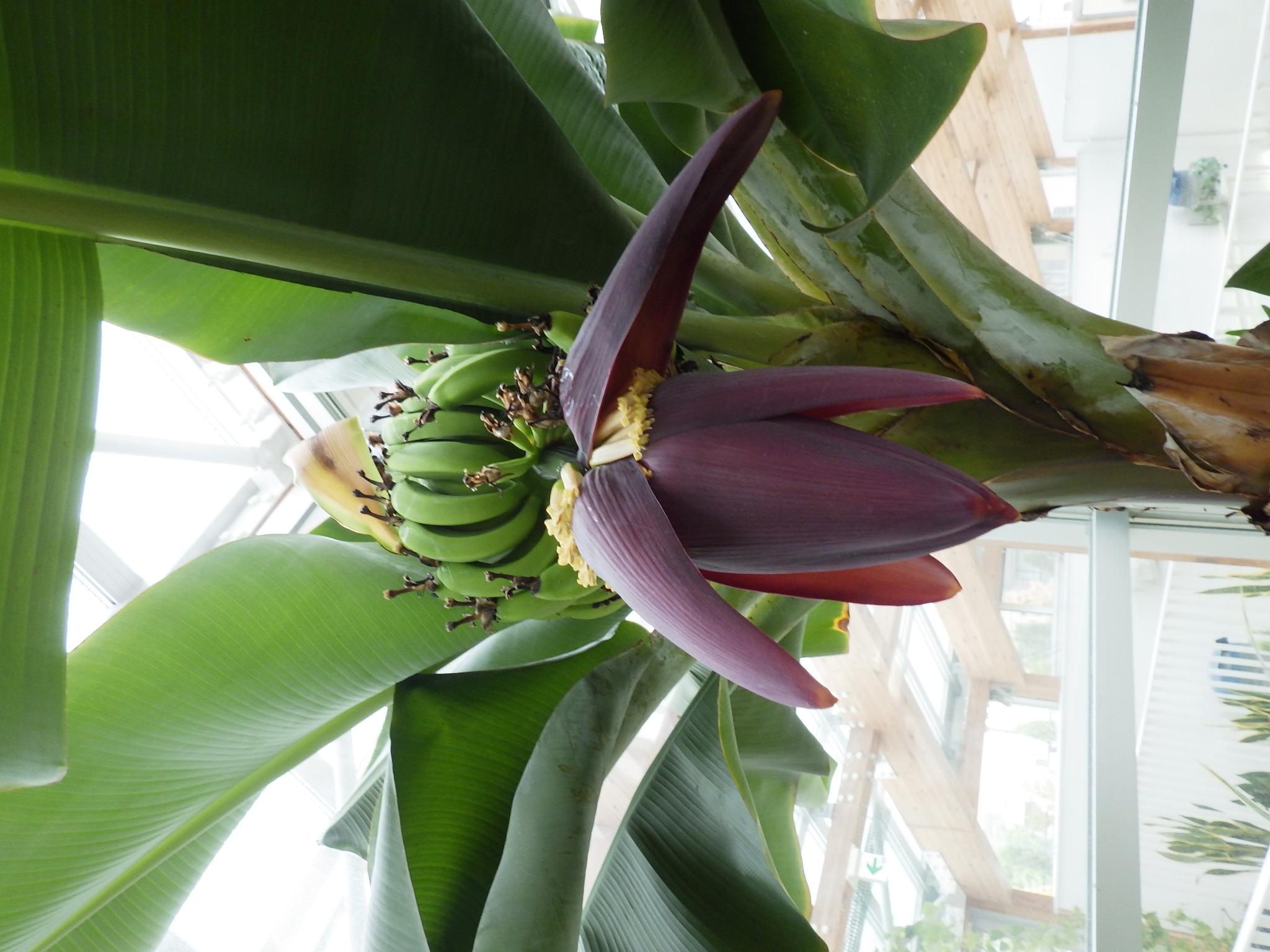 三尺バナナは背が低く、コンパクトなので鉢で育てられるのが良いところ。豊平公園のように小さな植物園にはもってこいな植物ですね。もっと良いのは鉢で育てているのでちょうど良いところに移動ができるので、花や実の様子がよく見れるのです。