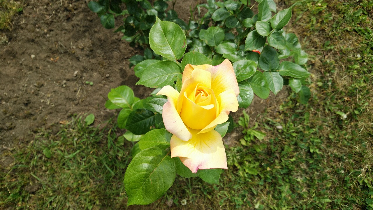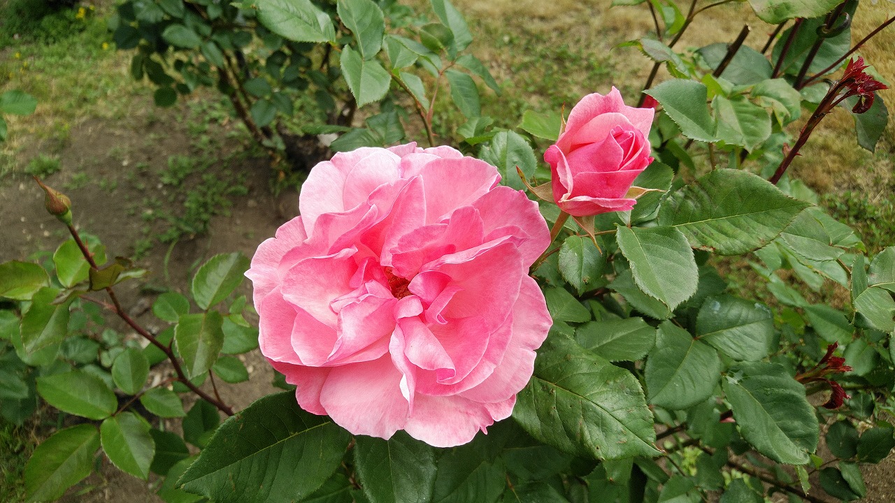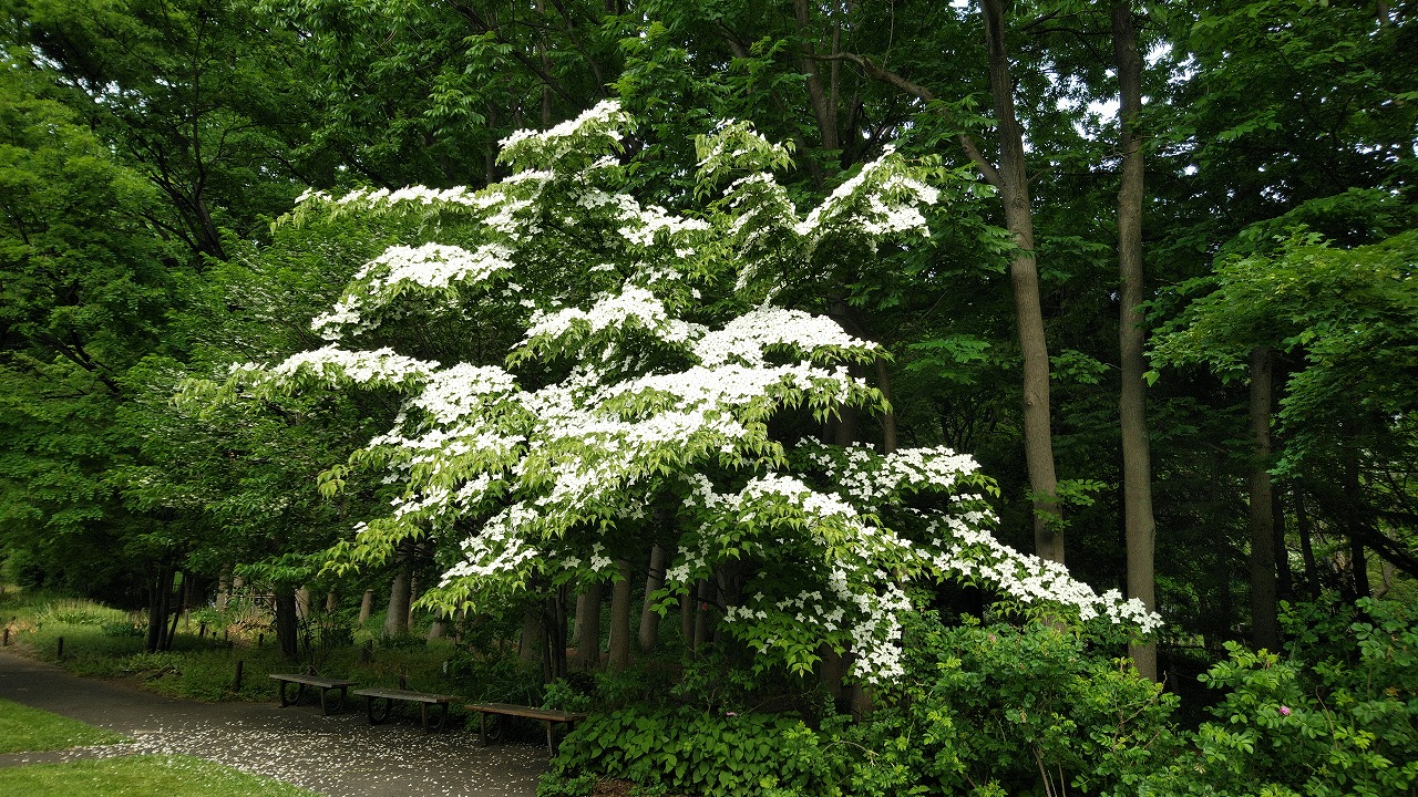 バイカウツギの写真左手にはヤマボウシ‘サトミ’が咲いています。ほんのりピンクで目立ちます。