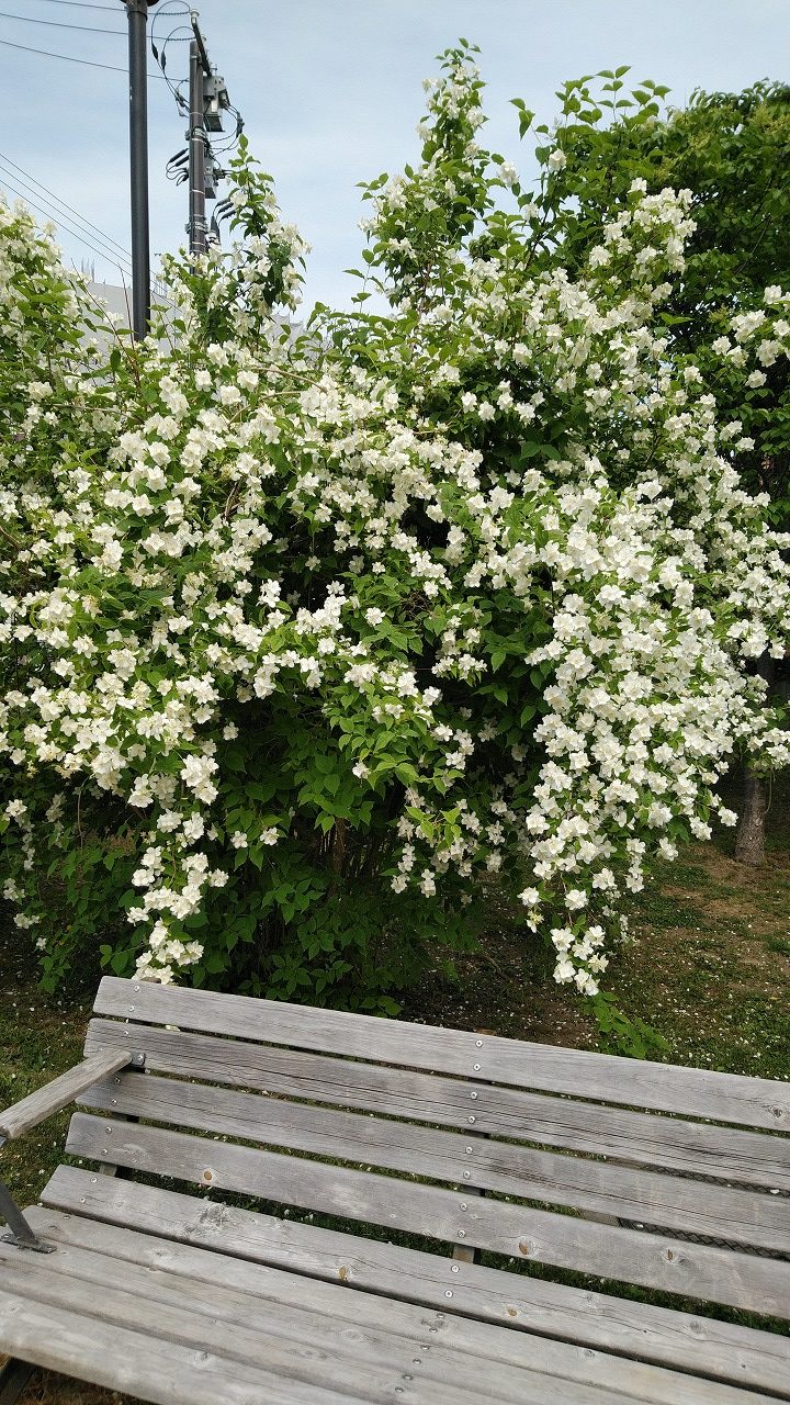 センター横ではバイカウツギが満開。ベンチに座って写真を撮るのに、ちょうどいいかもしれません。