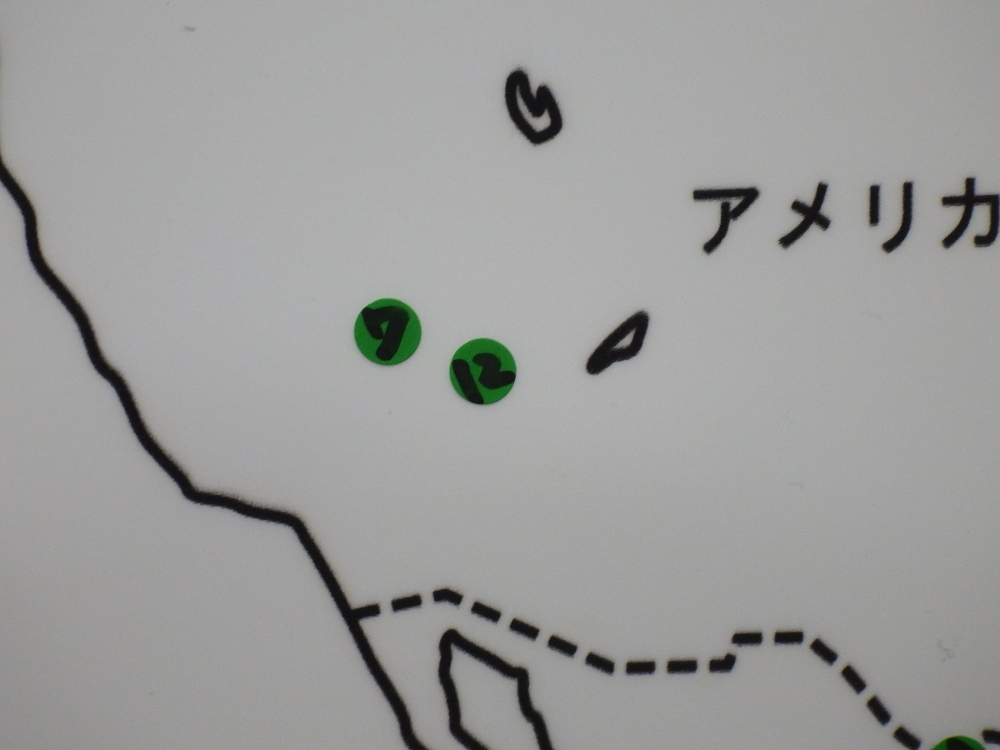 世界の白地図。この中には所々に緑や赤、青などの色のついたシールに文字が書かれています。