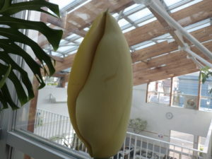 花といってもまだ蕾ですが、モンステラの薄いクリーム色をした仏縁苞が開きかけている、というのが正しいところです。