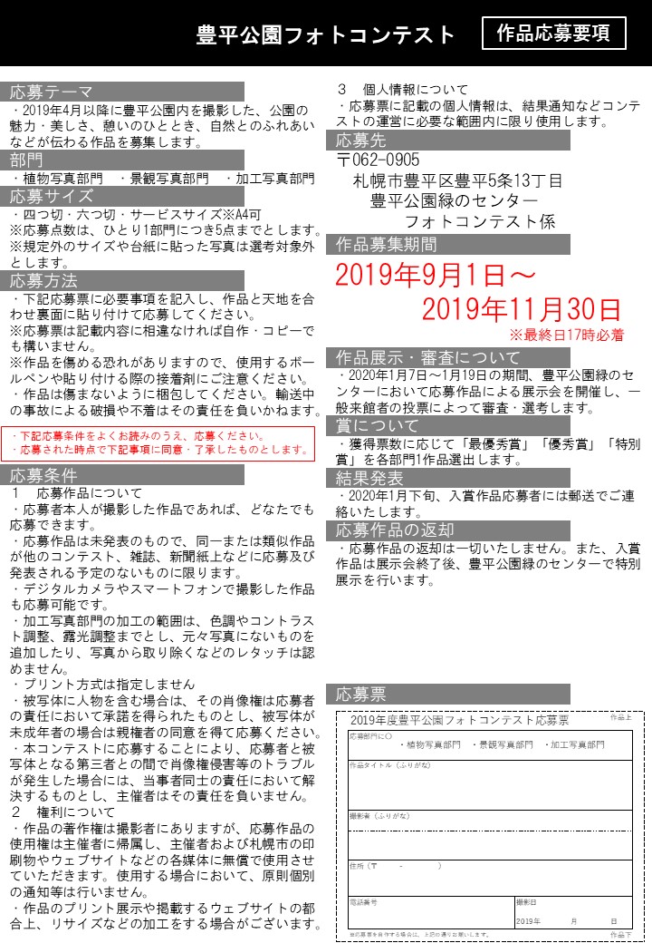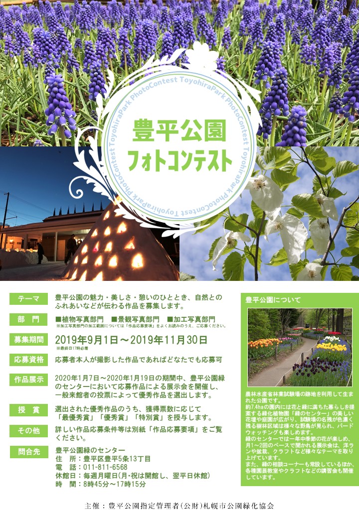 現在、2020年1月7日~1月19日に開催予定の「豊平フォト展」に向けて、緑のセンターでは展示用の作品を募集しています。