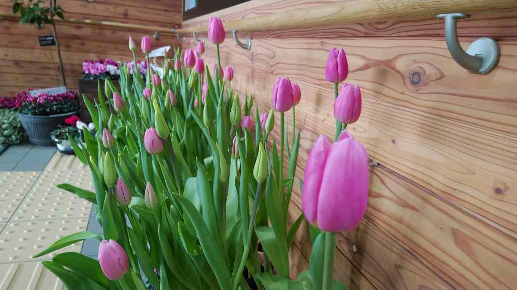 まずは、正面玄関に入るともう春が来た!?チューリップが咲き始めました。ピンクの花が先に咲き始めましたが、後から黄色も咲きます。とある種苗会社さんから提供していただいたアイスチューリップ。あらかじめ球根を植えた鉢を一定期間冷凍保存して冬を体験させ、その後自然の温度下に置くことによって春が来たと錯覚して咲いてくれるという仕組みです。温度の低い冬に咲くので花持ちがよく、1ヶ月はもちますよとのことですが、センターでは初の試しみ。どれくらい咲いてくれるのか、楽しみです。
