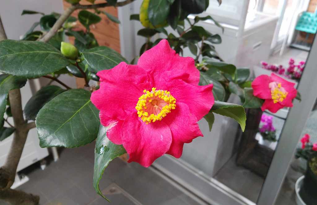 玄関内と受付前には色んなツバキが並んでいます、