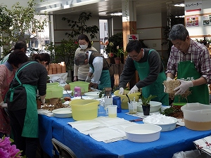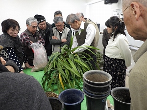 緑の相談員がマンツーマンで指導しながら、コチョウランの植え替えを行います。