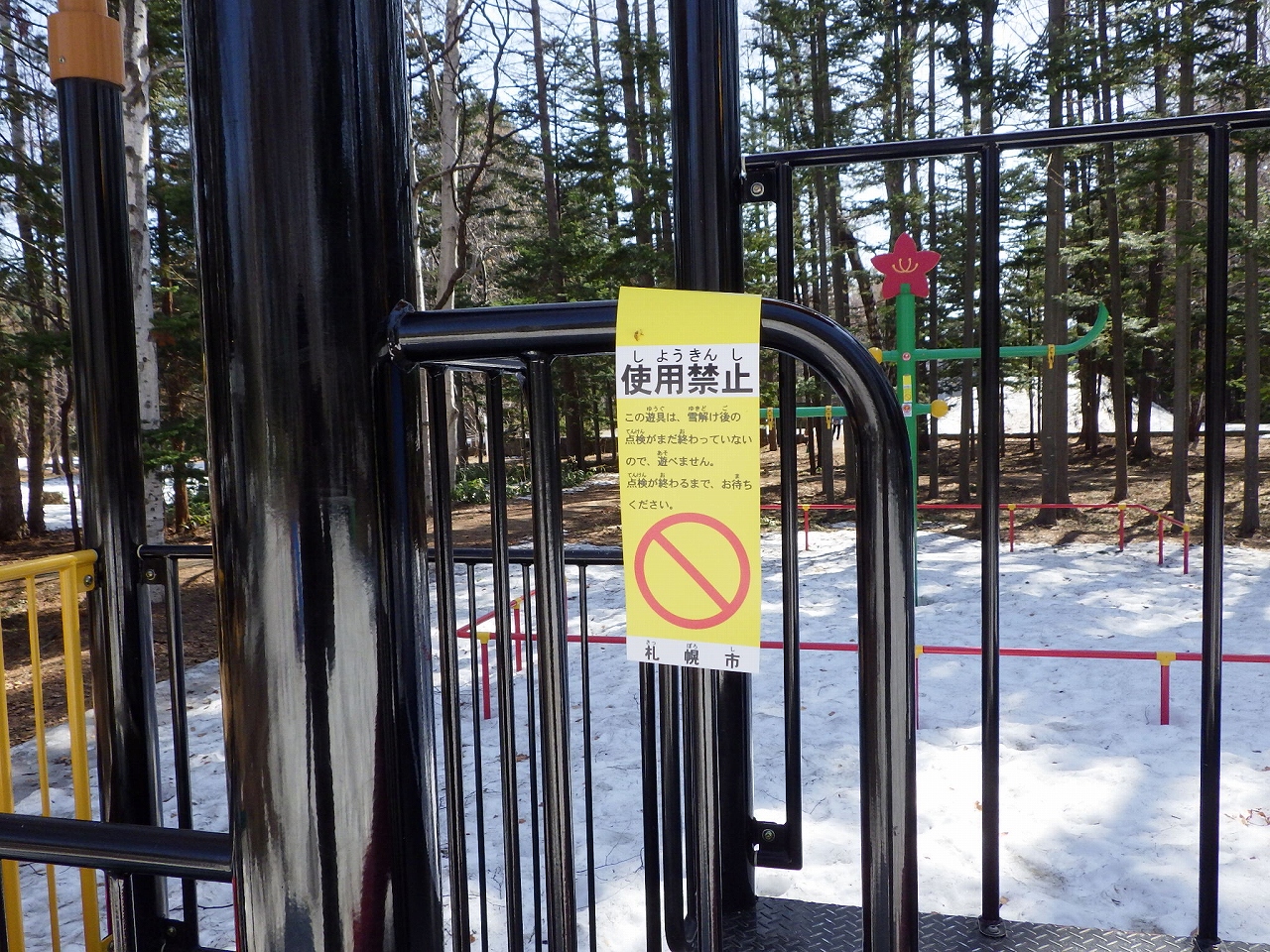 雪解けが進み、豊平公園の遊具広場も地面が見え始めておりますが、遊具はまだ使用出来ません。