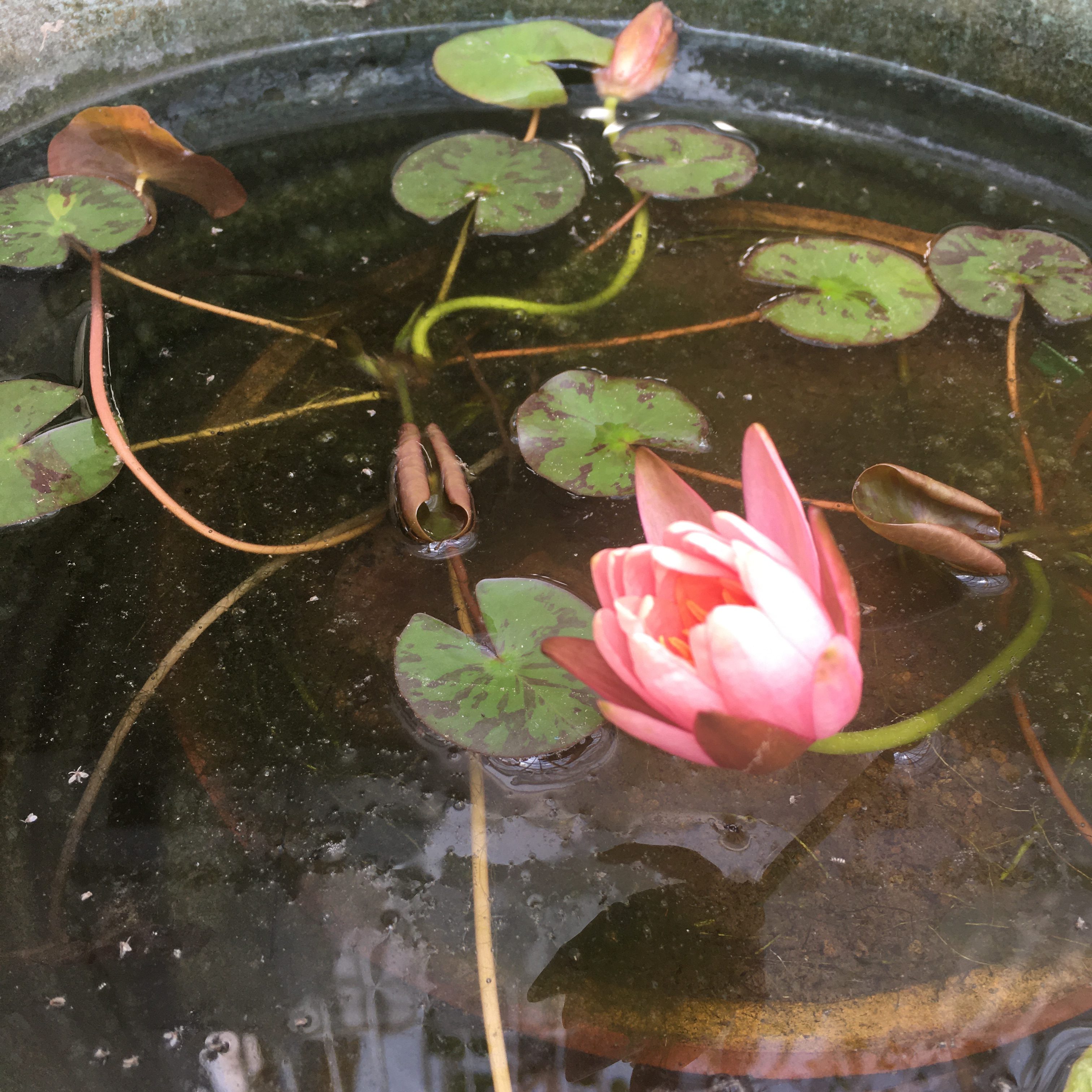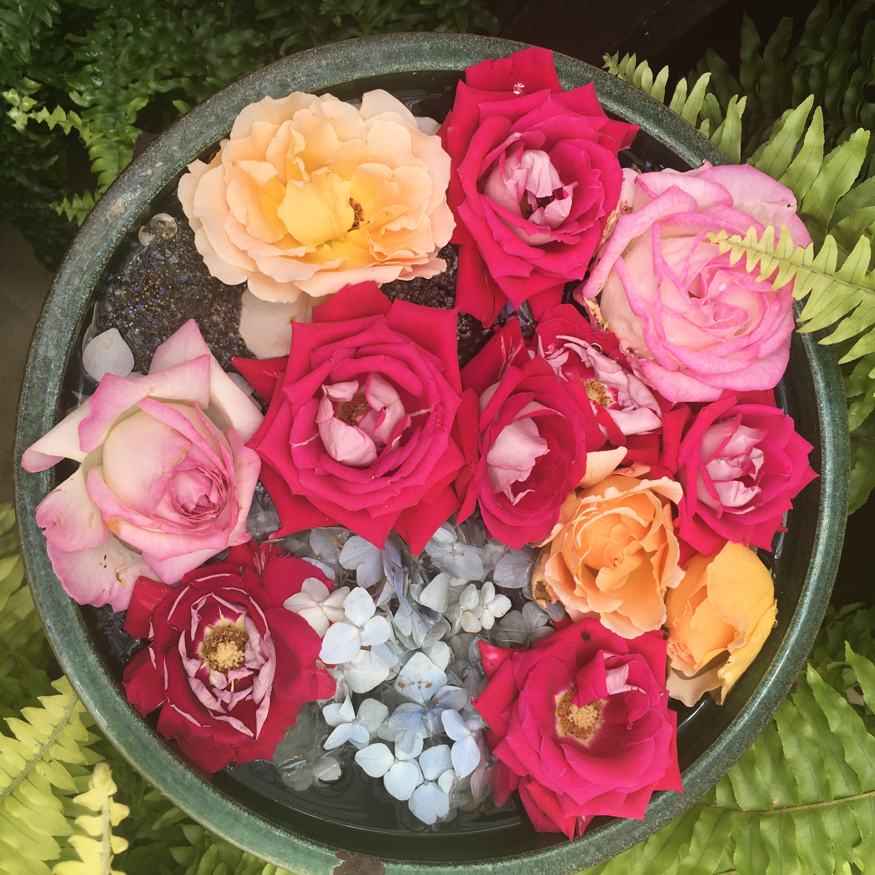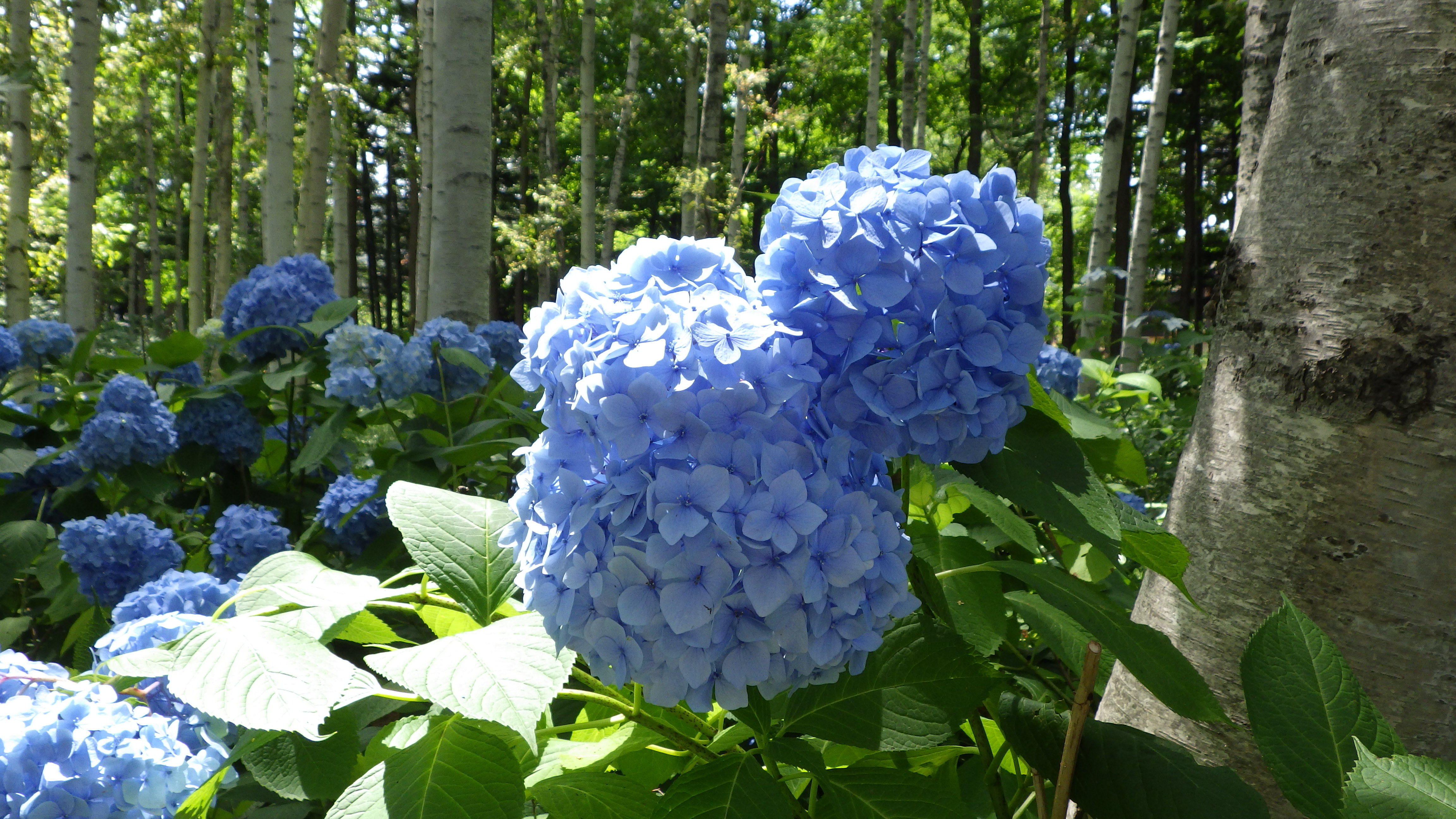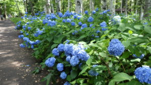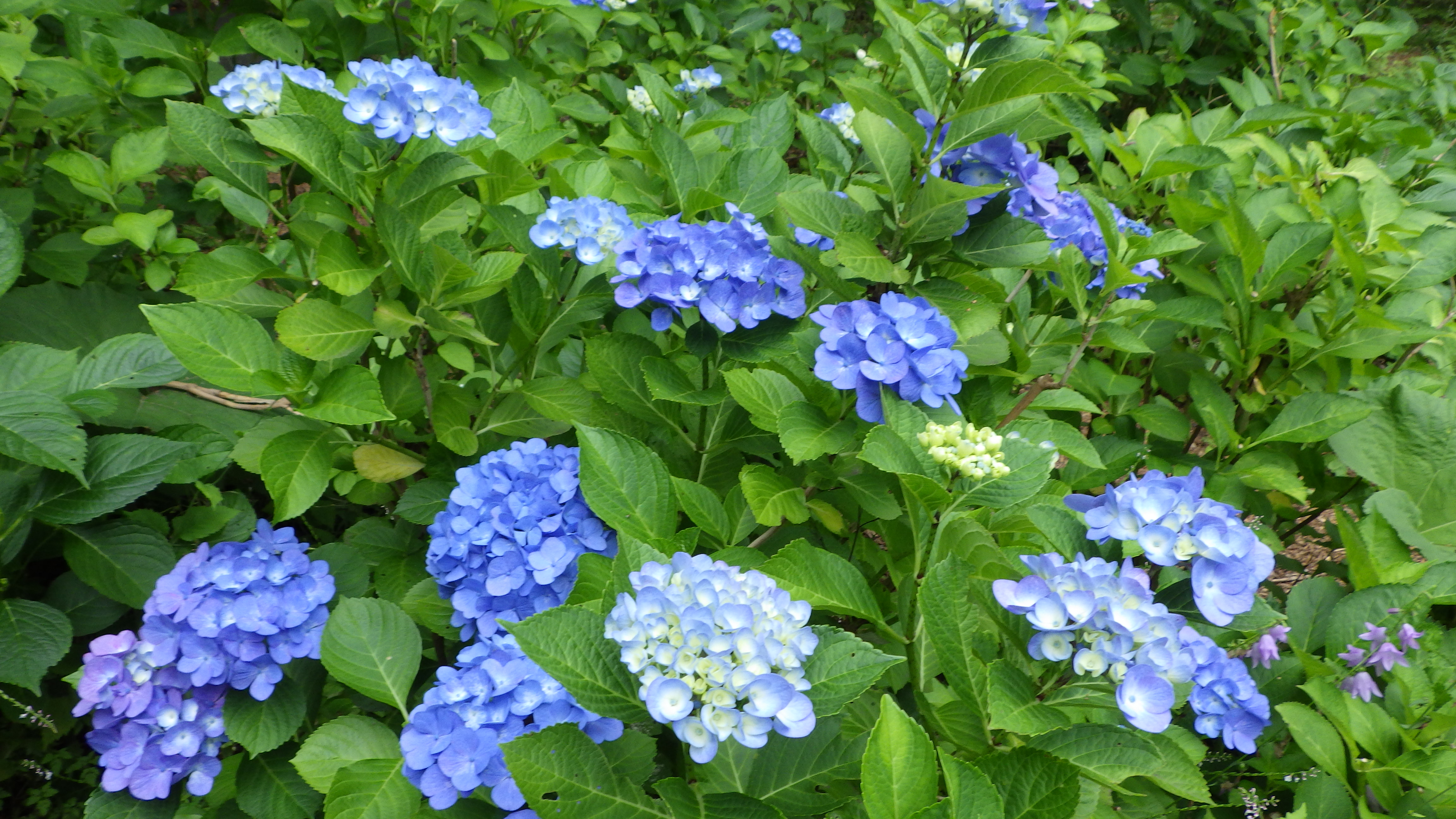 赤や青のヤマアジサイやてまり咲きのアジサイが咲いています。