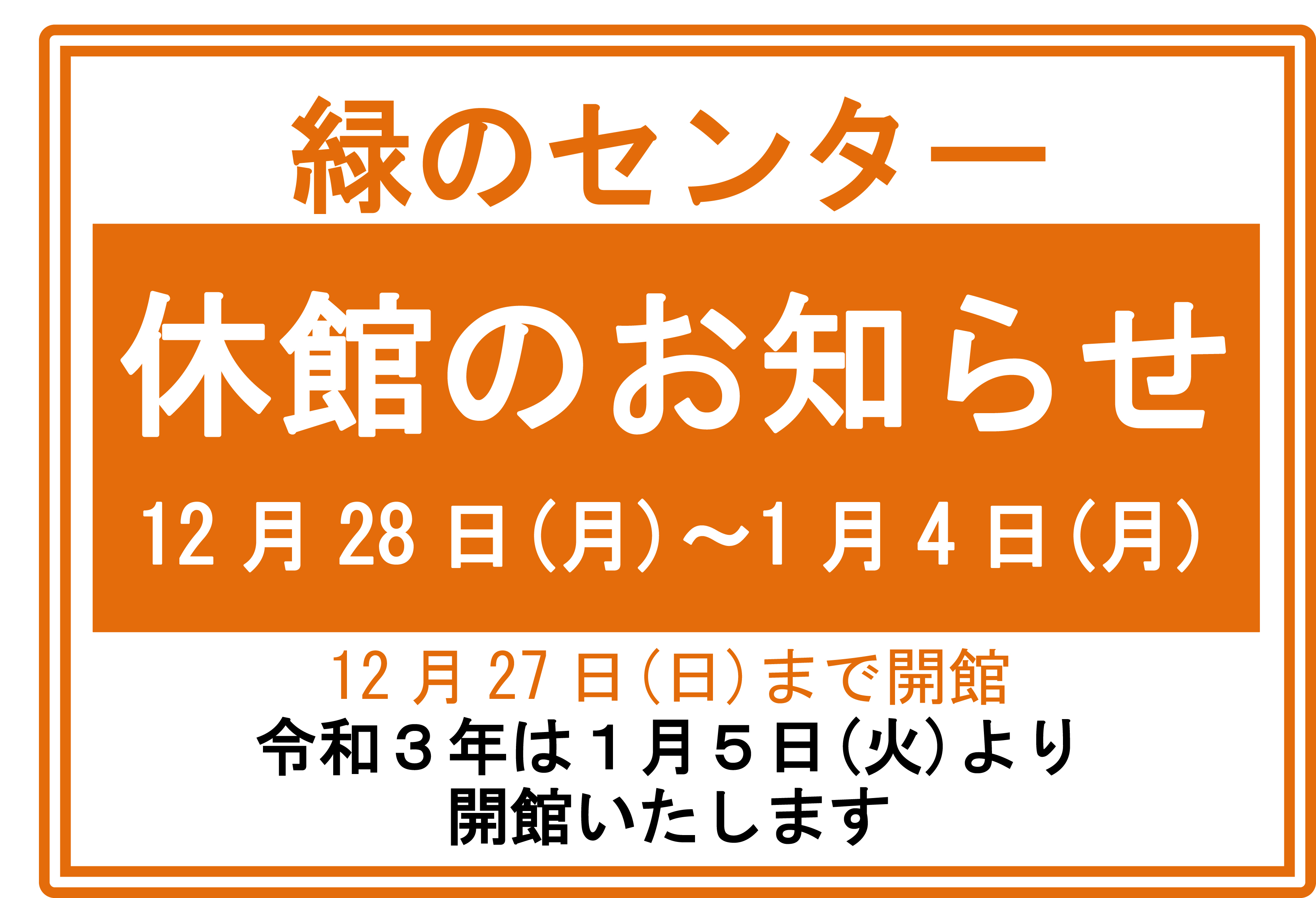豊平公園緑のセンターでは令和2年12月28日から令和3年1月4日までを年末年始の休業期間とさせていただきます。