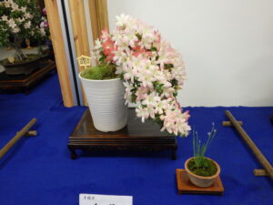 この展示会は花盛りのサツキ盆栽がメインになります。