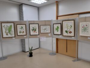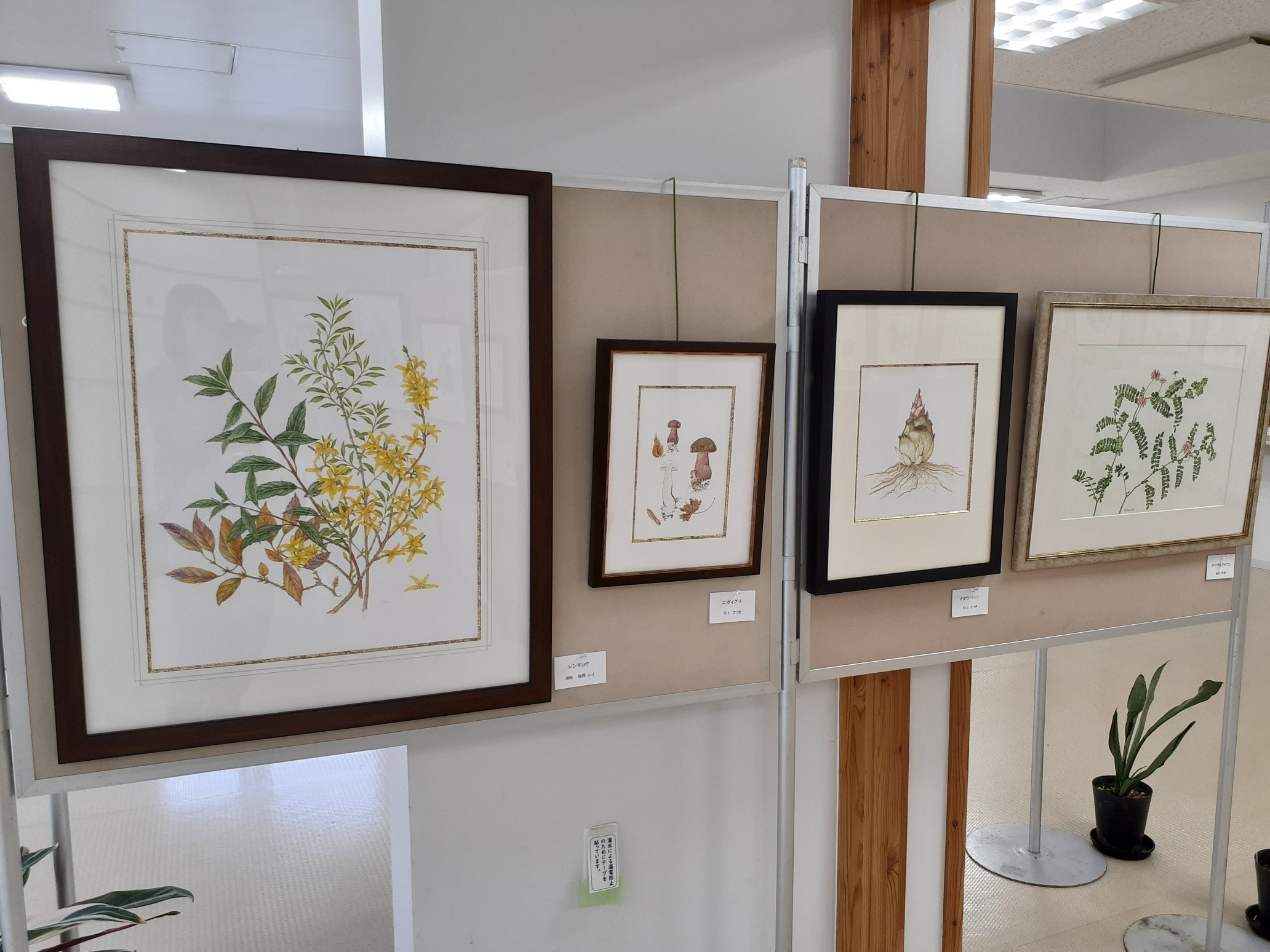 1階事務所受付ではさっぽろ植物画同好会の皆さんの絵を使った