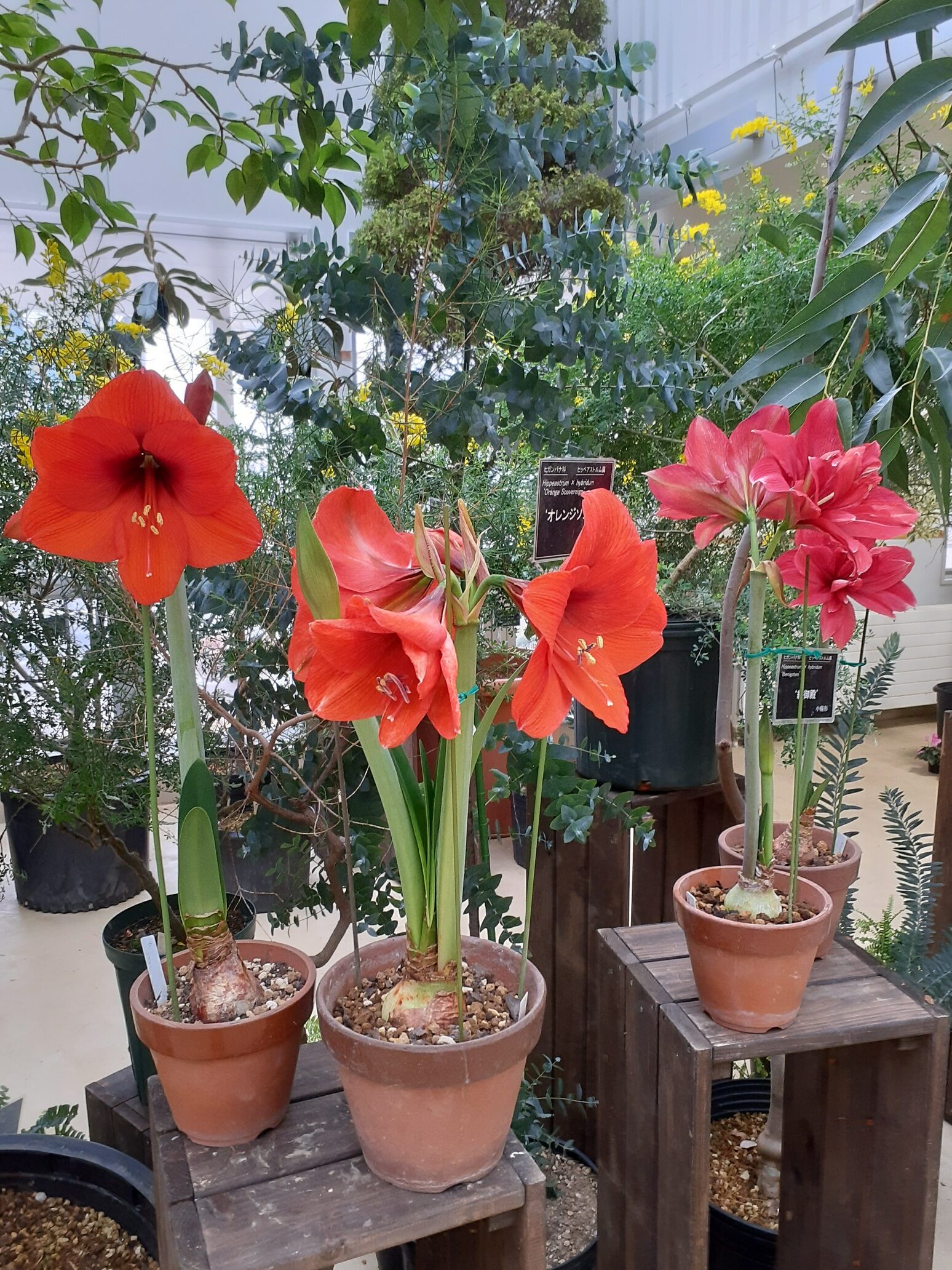 上の写真はアマリリス。写真には朱色の品種が集まっておかれています。
