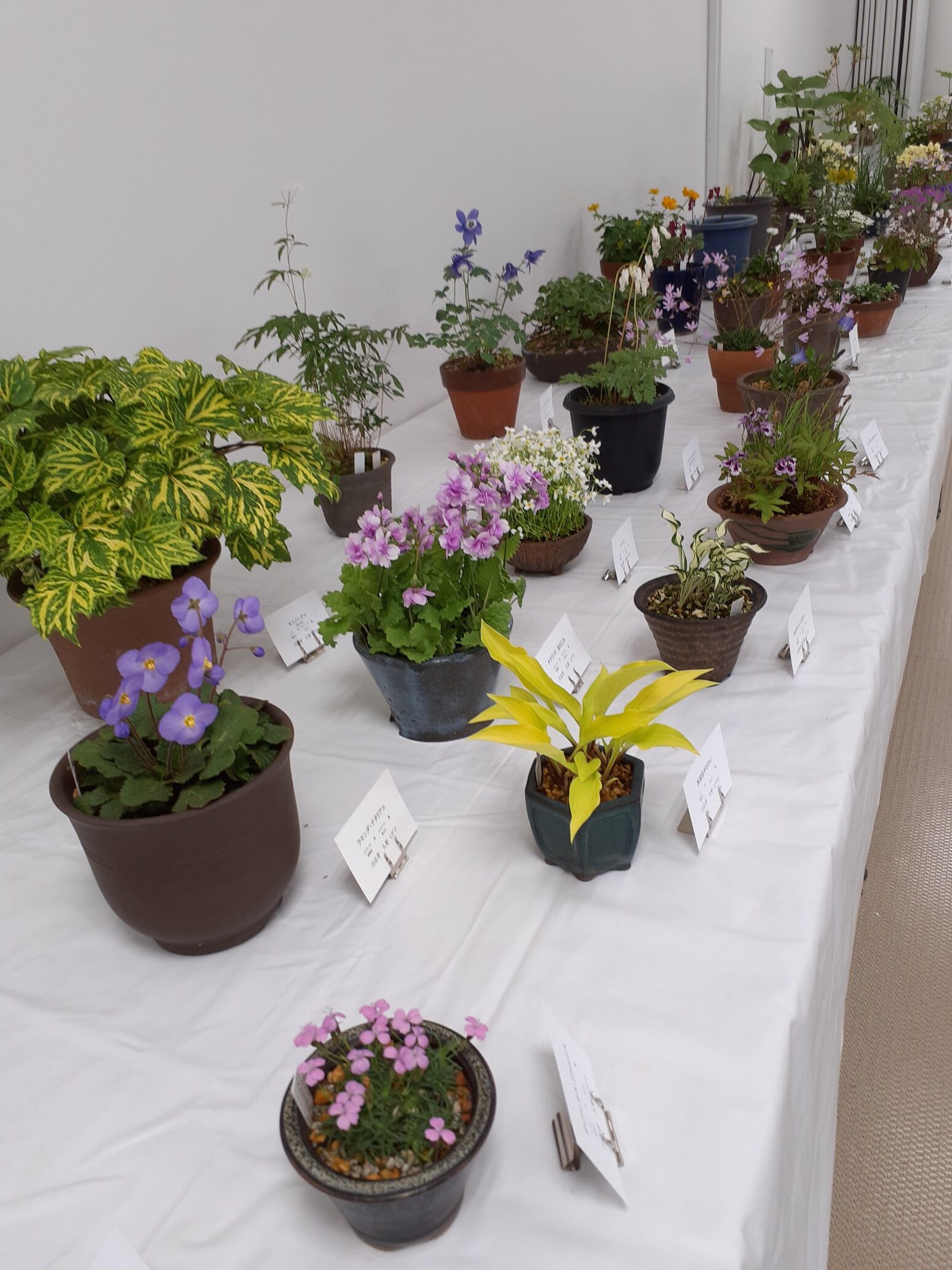 北海道山草会の会員の皆さんの栽培品、187鉢が並びます。