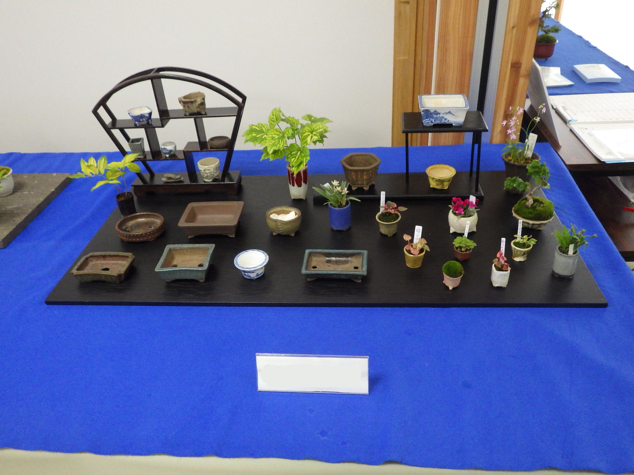草花など草本植物を盆栽のように小さな鉢に植え、形を整えて育てたものを「盆草」ともいうそうで、この盆草が多く飾られるのもこちらの会の展示会の特徴です。