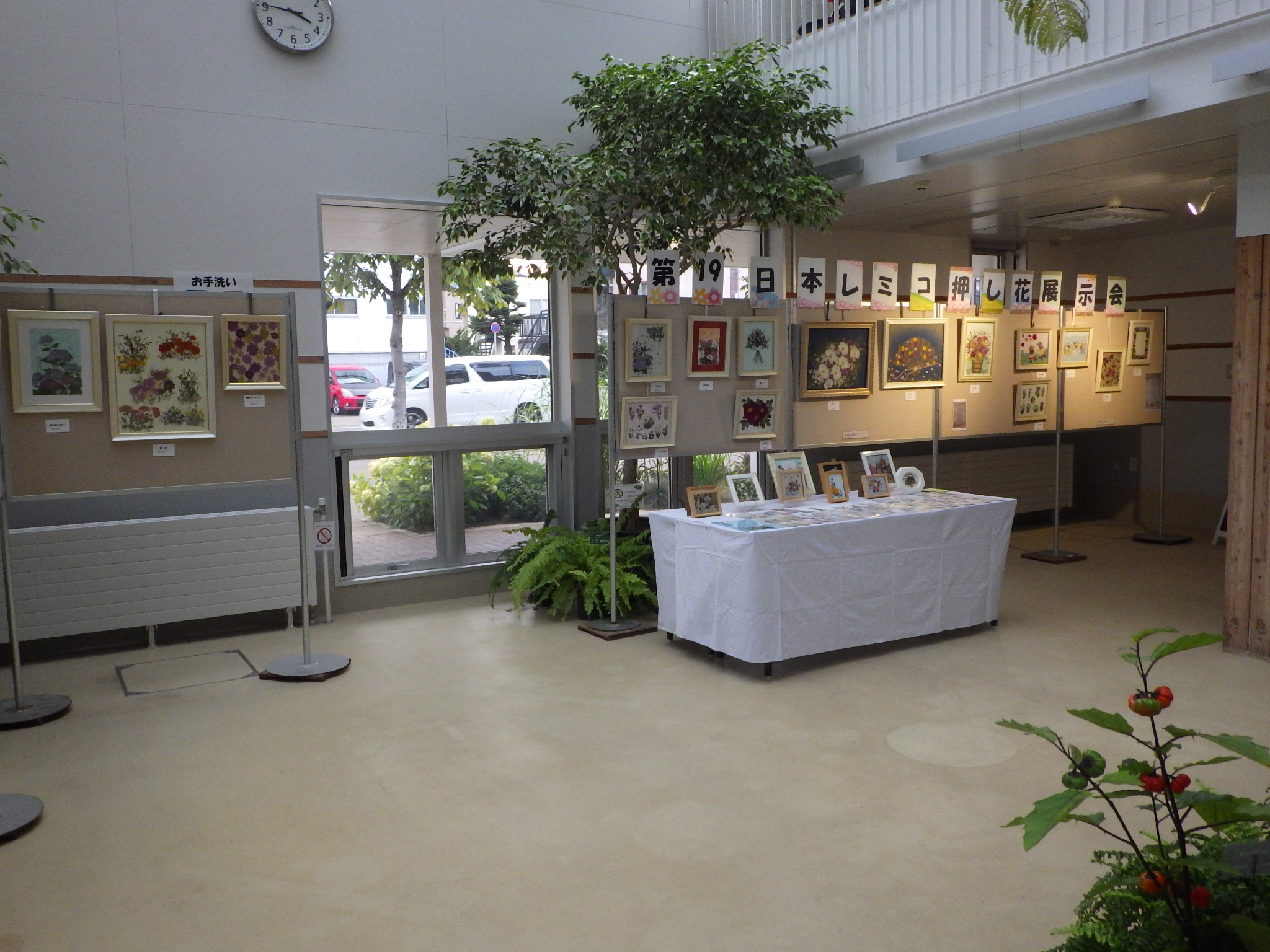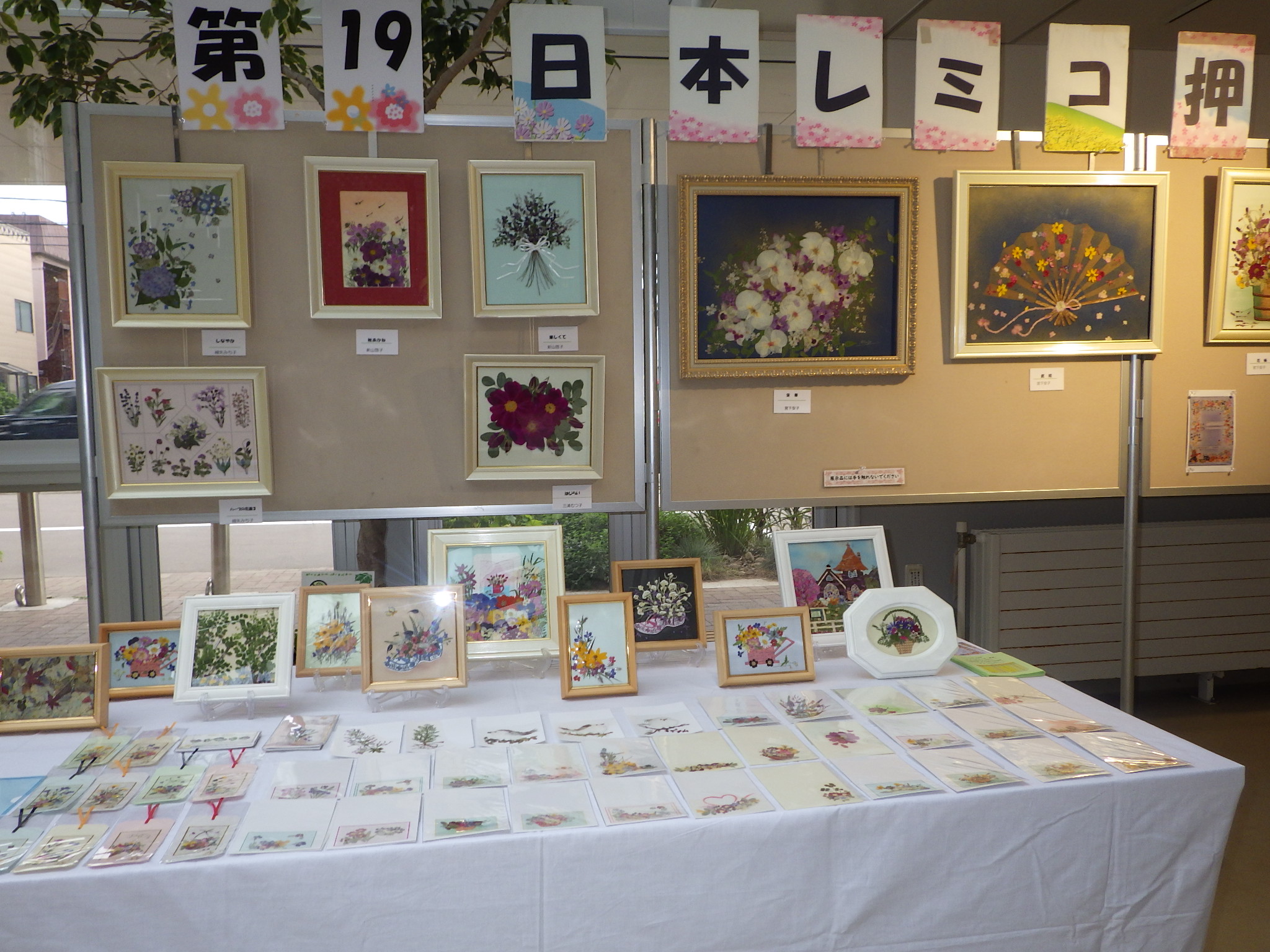 日本レミコ押し花学院の先生と生徒さんの作品が並びます。