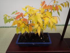 カエデの葉色や赤い実がかわいらしい盆栽。