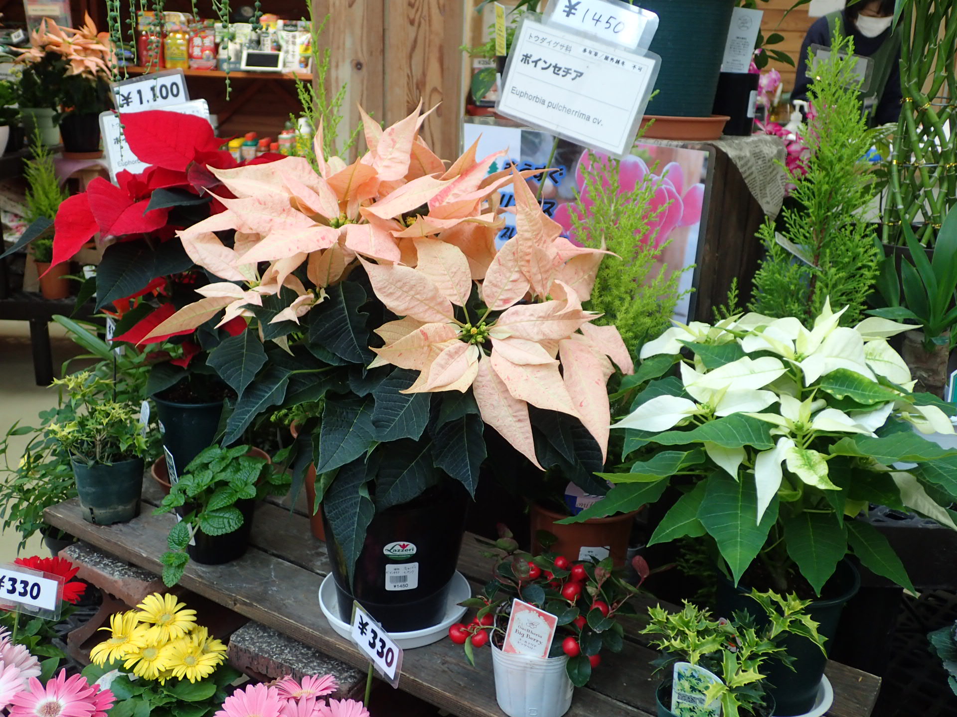 クリスマスに人気のポインセチアは、赤や白以外の色も入荷しております。
