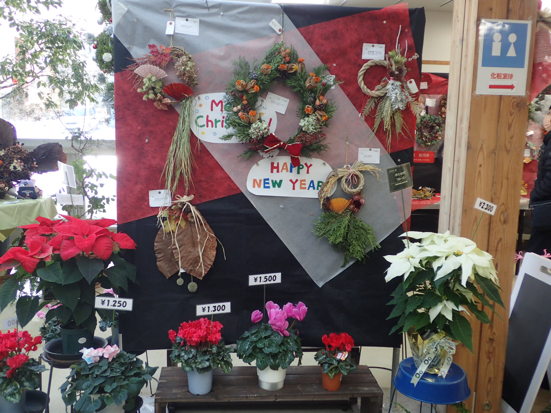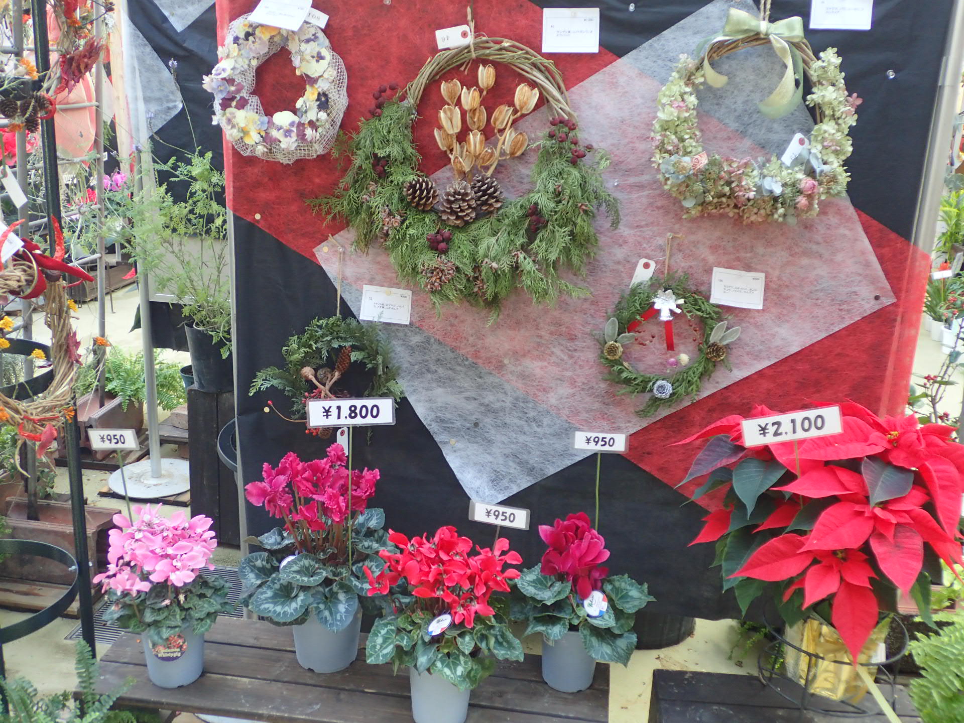 リース類の展示の近くには、ポインセチアやシクラメンの販売品も一緒に並んでいます。