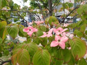 上の写真はヤマボウシ’サトミ’。このヤマボウシは総苞片(葉が変化したもの)がピンクです。