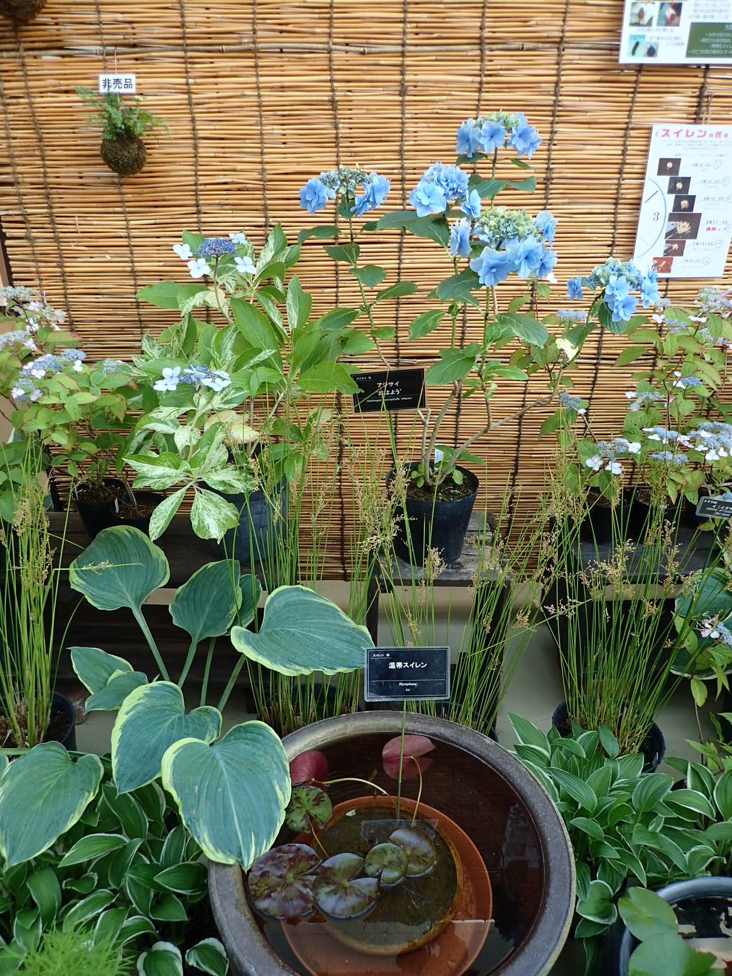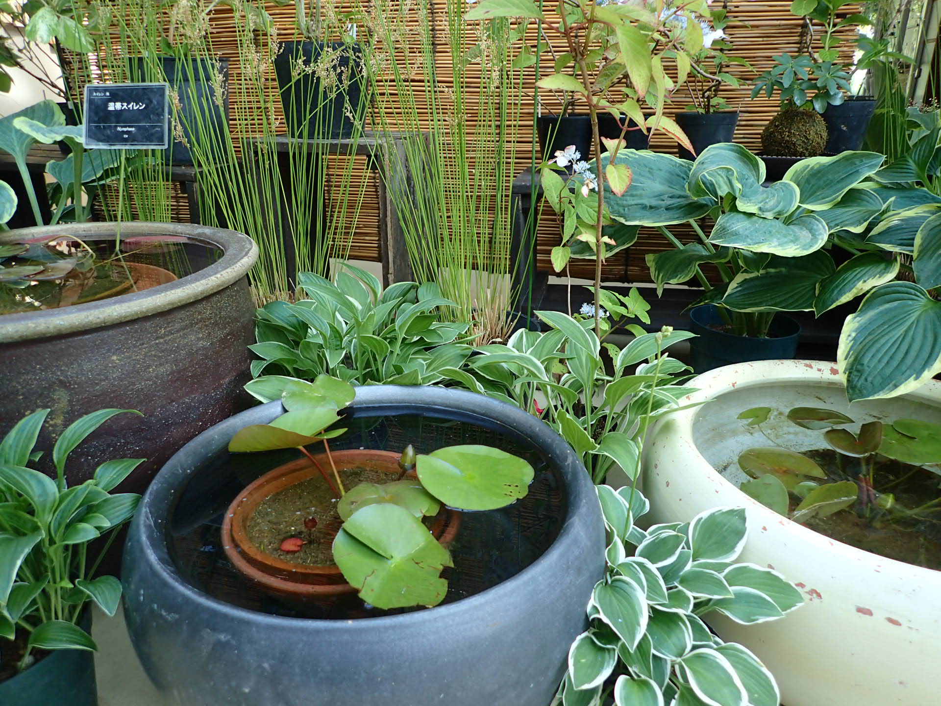 上の写真はすだれのまえにい草やアジサイ、温帯スイレンの入った水鉢等で