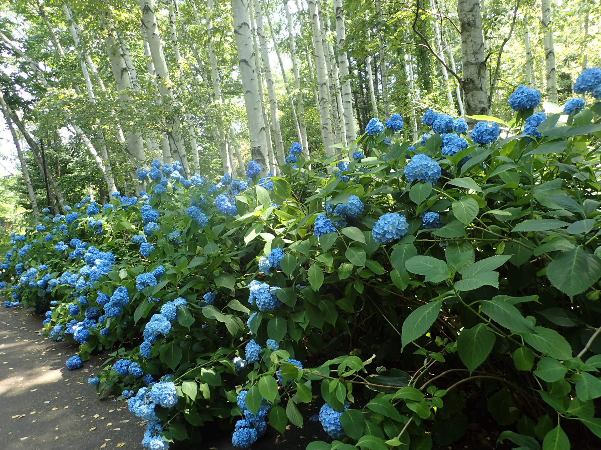 この時期豊平公園の園内で一番のスポットはシラカバ林と青いアジサイですよね。
