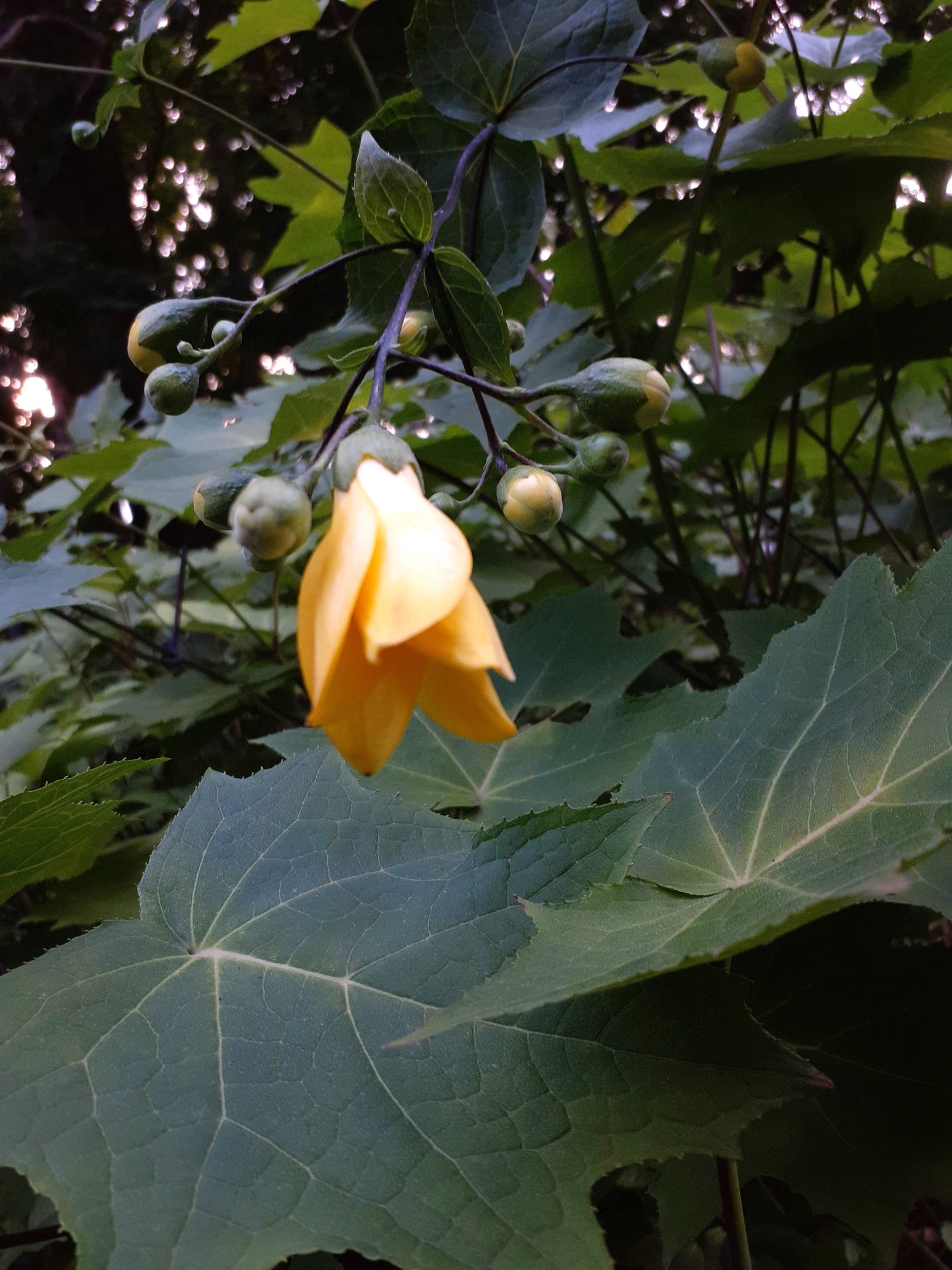 大きな掌状の葉の上に黄色でラッパ型の花が咲き、周囲には丸い蕾が付いている