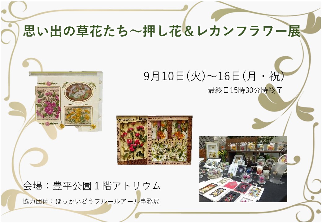 豊平公園緑のセンター1階アトリウムを会場に、思い出の花たち 押し花&レカンフラワー展を開催いたします。
