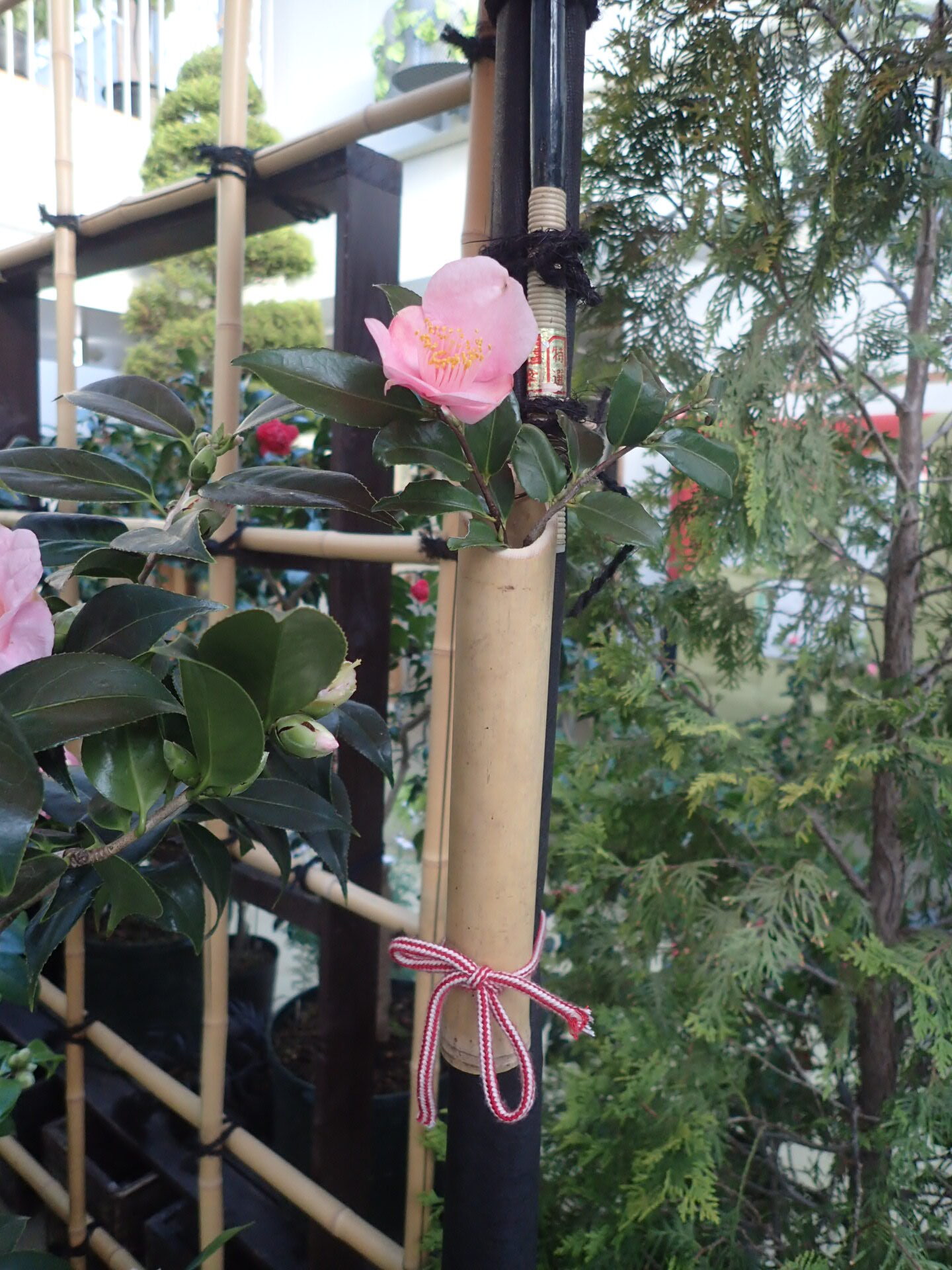 「和」がとても似合うツバキには、垣根と和傘を合わせて展示しています。