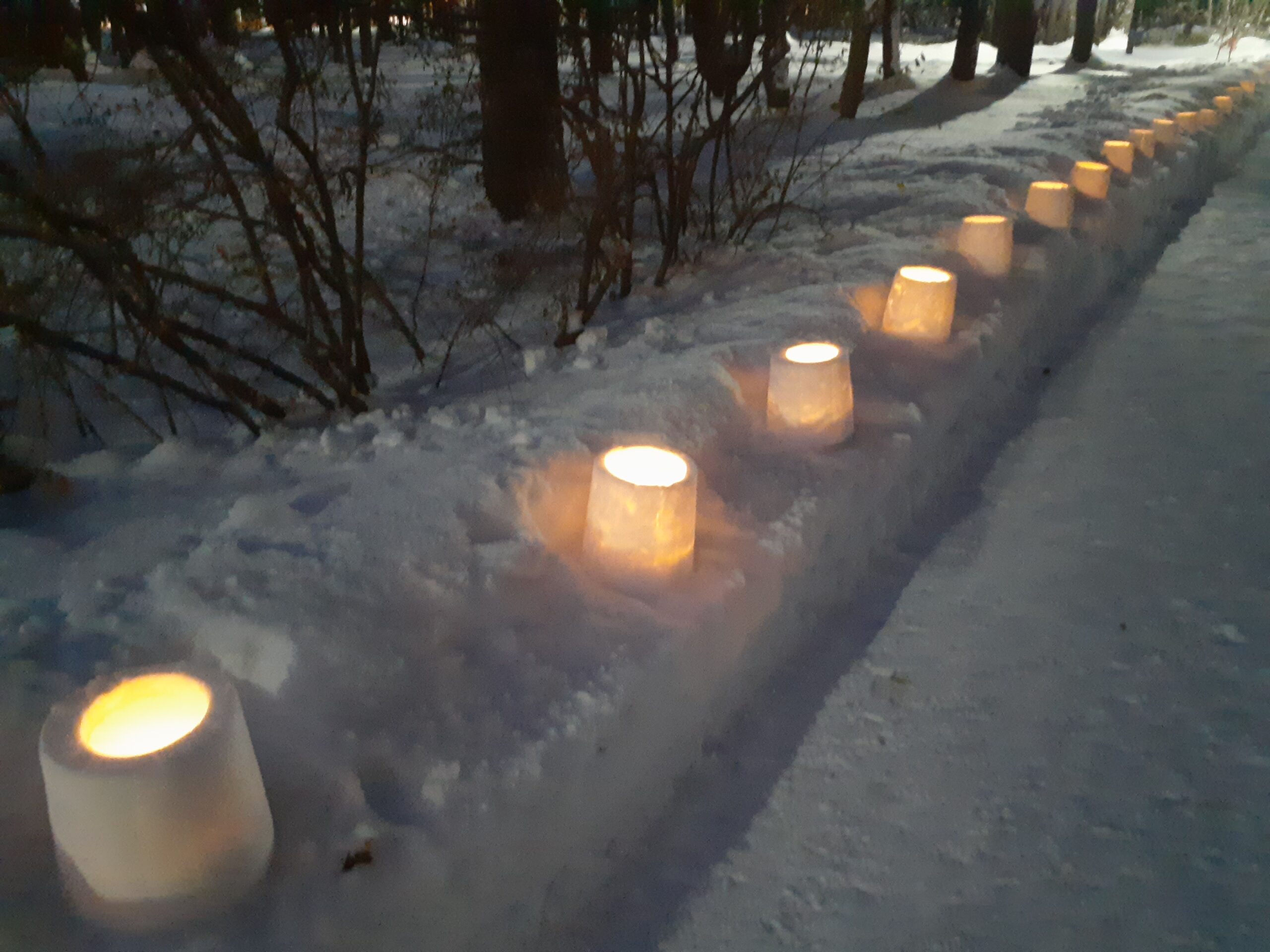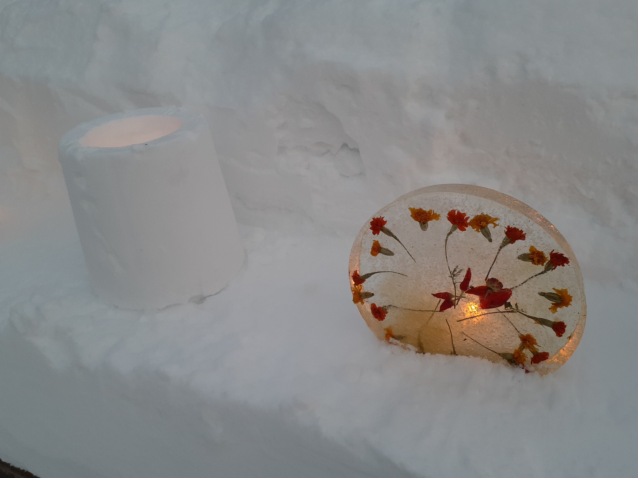 上の写真は雪山に穴をあけてろうそくを灯しただけですが、きれいですよね。