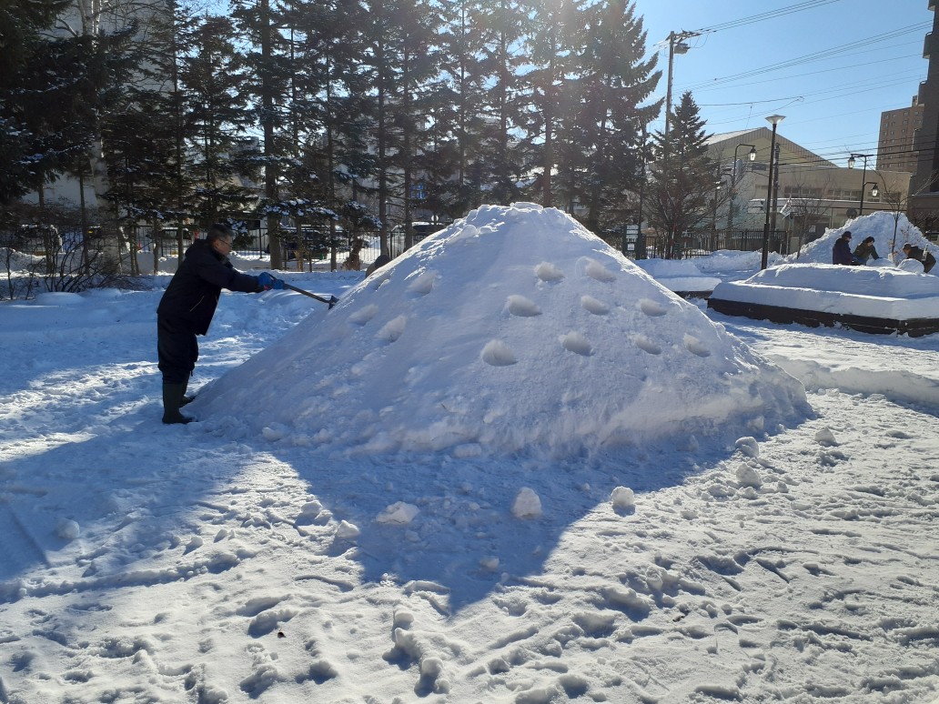 午前中はスタッフが土台と雪像づくりをしてくれました。