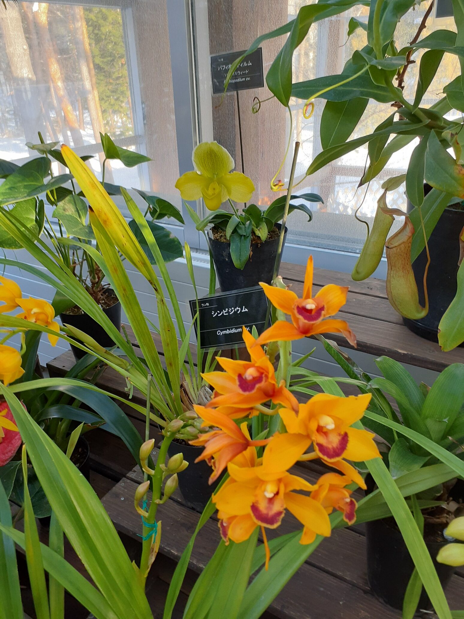 手前の肉厚な花弁で山吹色の花が咲いているのはシンビジウム。