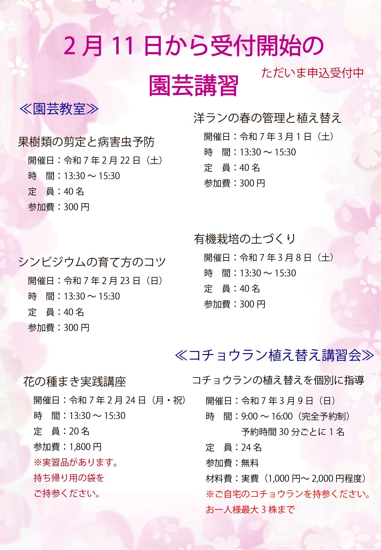 2月から3月の講習会でこれらの花後の管理方法などが学べます。