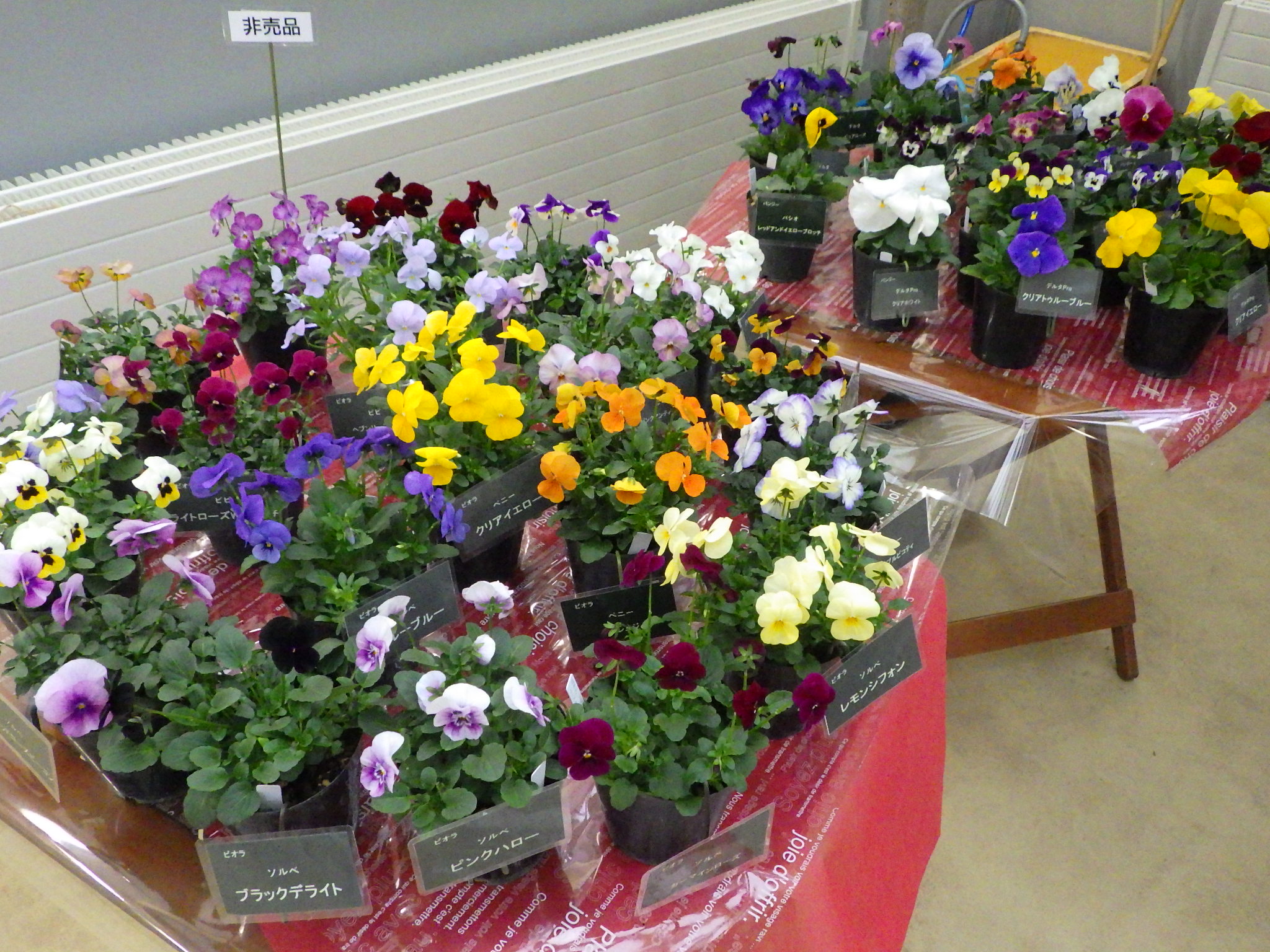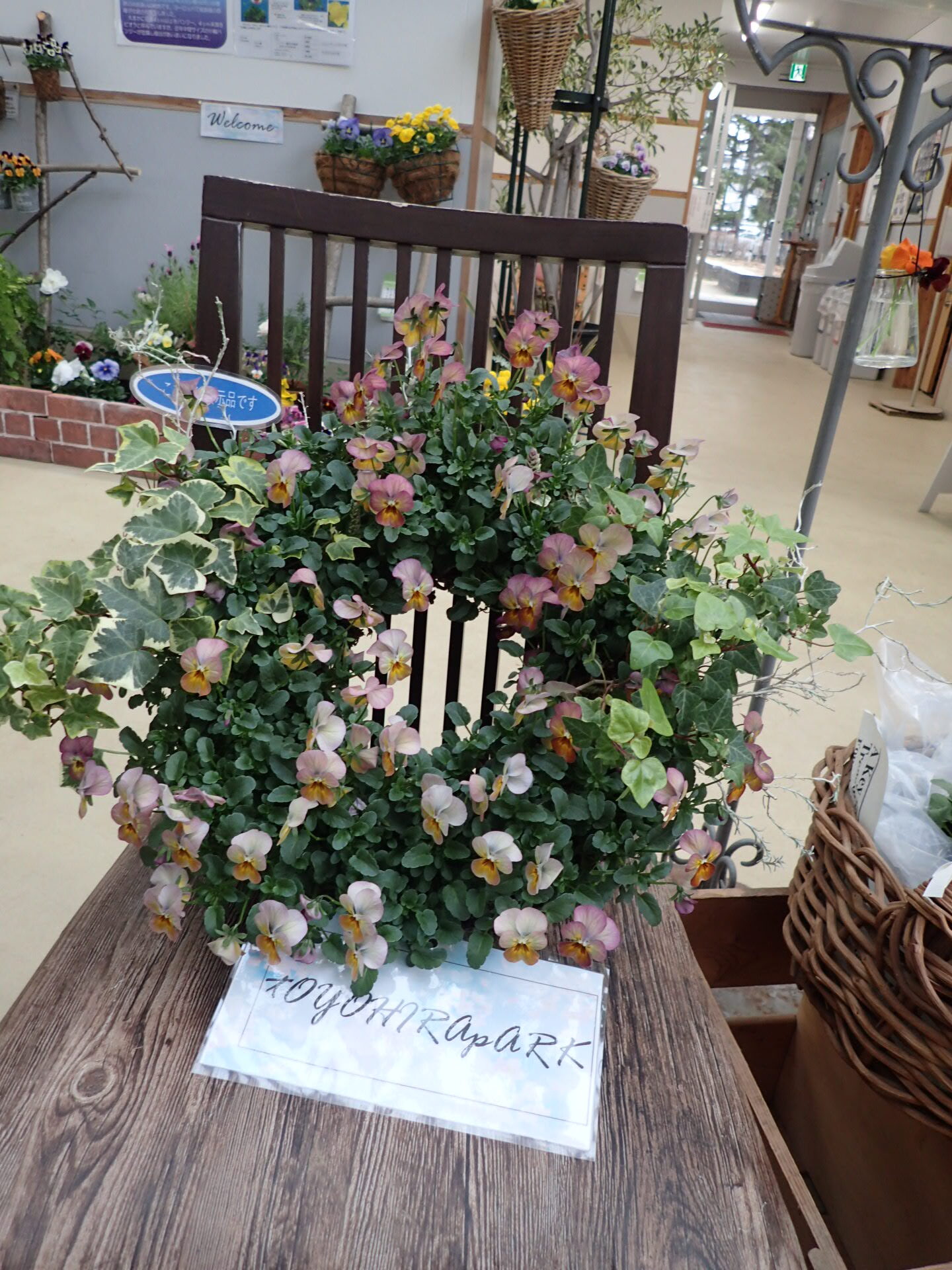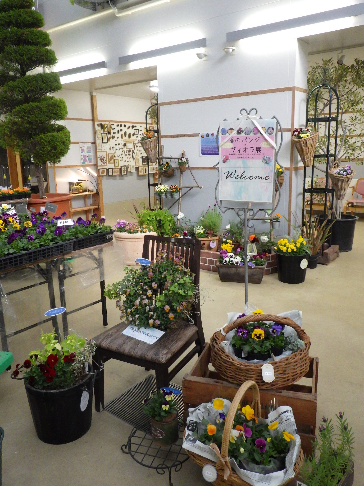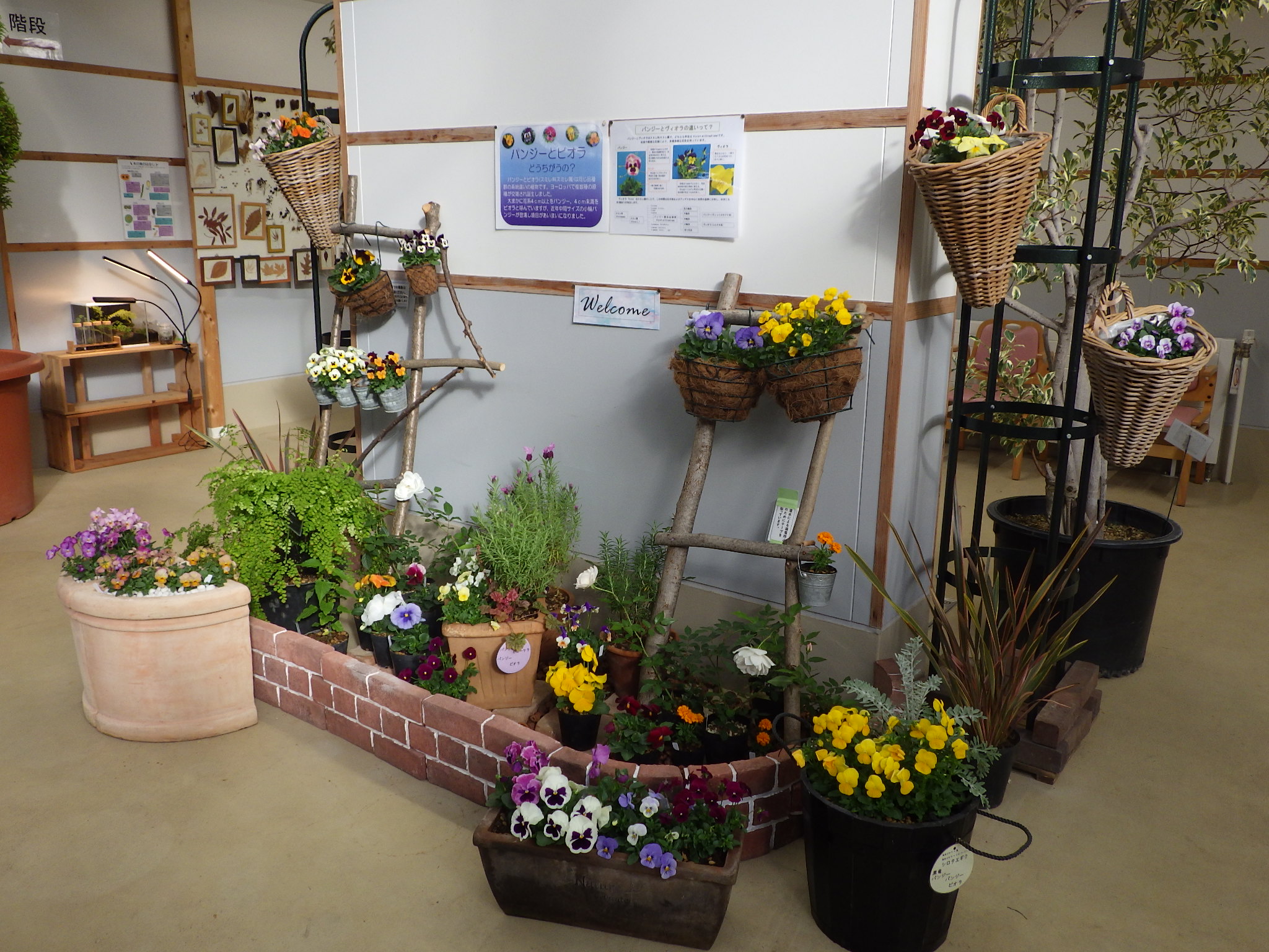 パンジーやヴィオラをメインにしたバスケットや寄せ植えを展示(下の写真)。