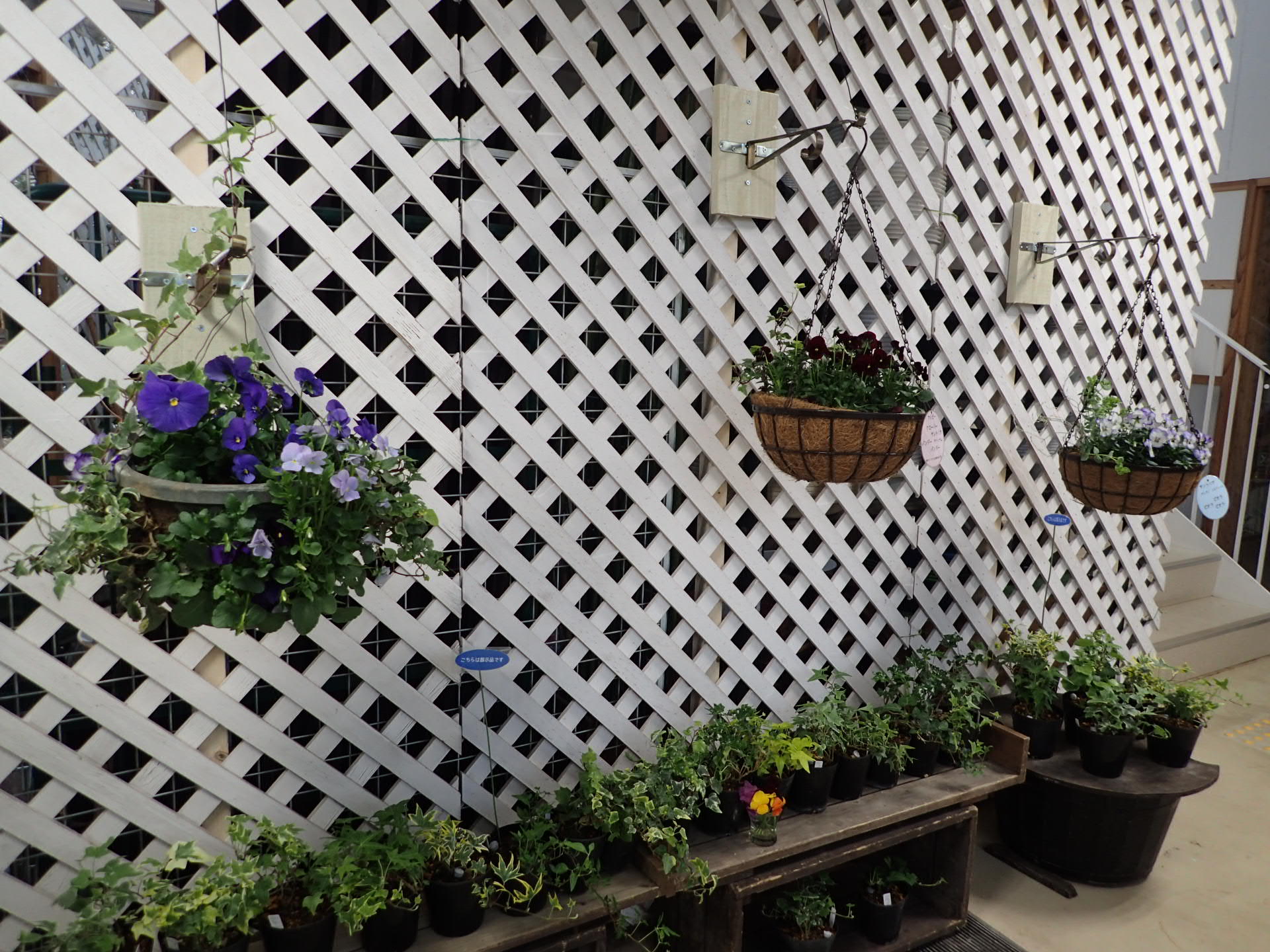 上の写真は丸いバスケットを吊下げてベランダ風に展示。