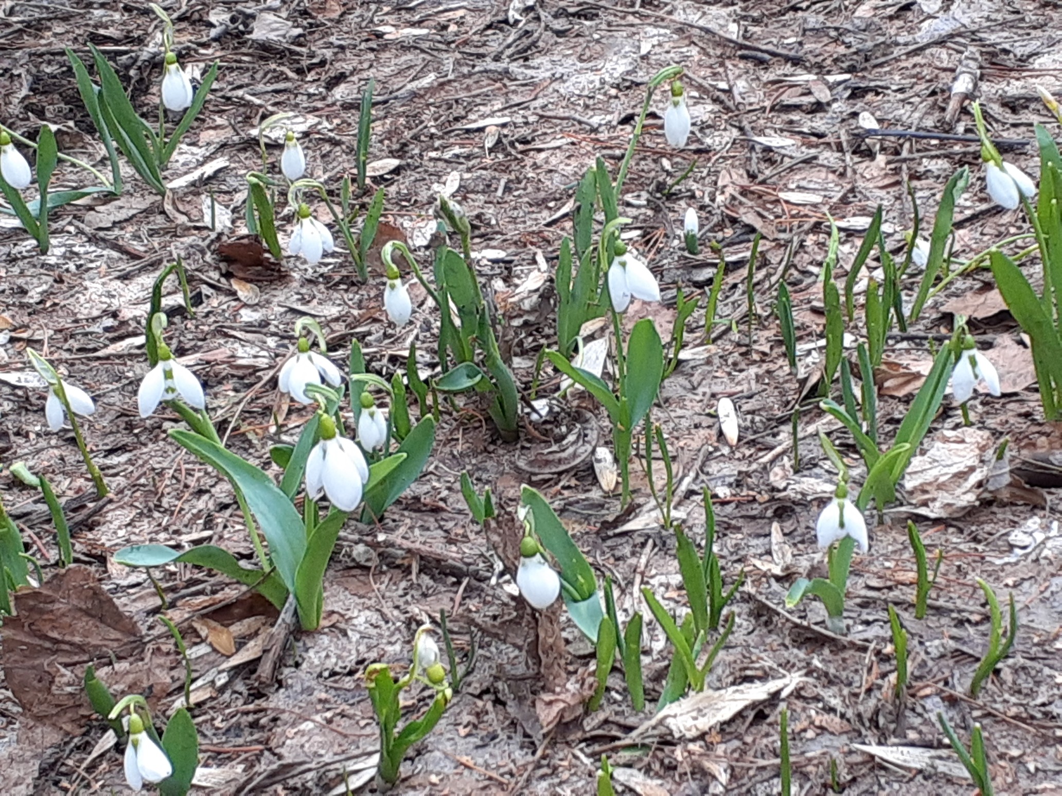 ヤチダモ並木と緑のセンター横の宿根花壇でスノードロップが咲いています。