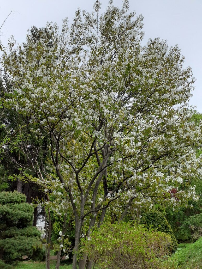 新芝生広場の築山横では、下の写真のようにジューンベリーが満開です。