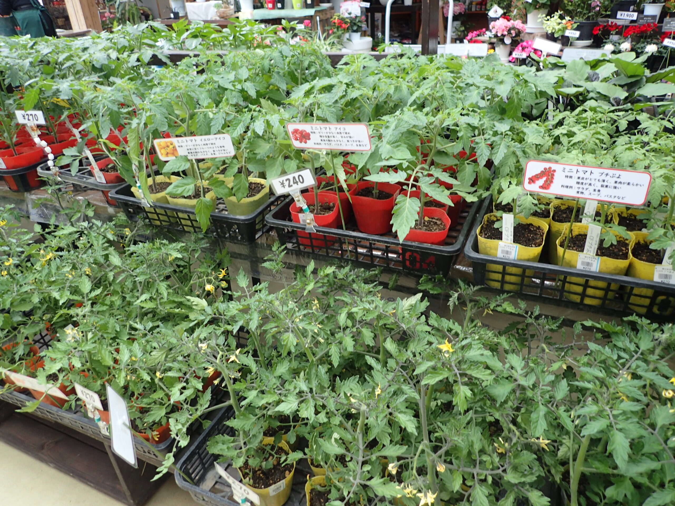 上の写真はトマトの苗が並ぶコーナーの様子です。
