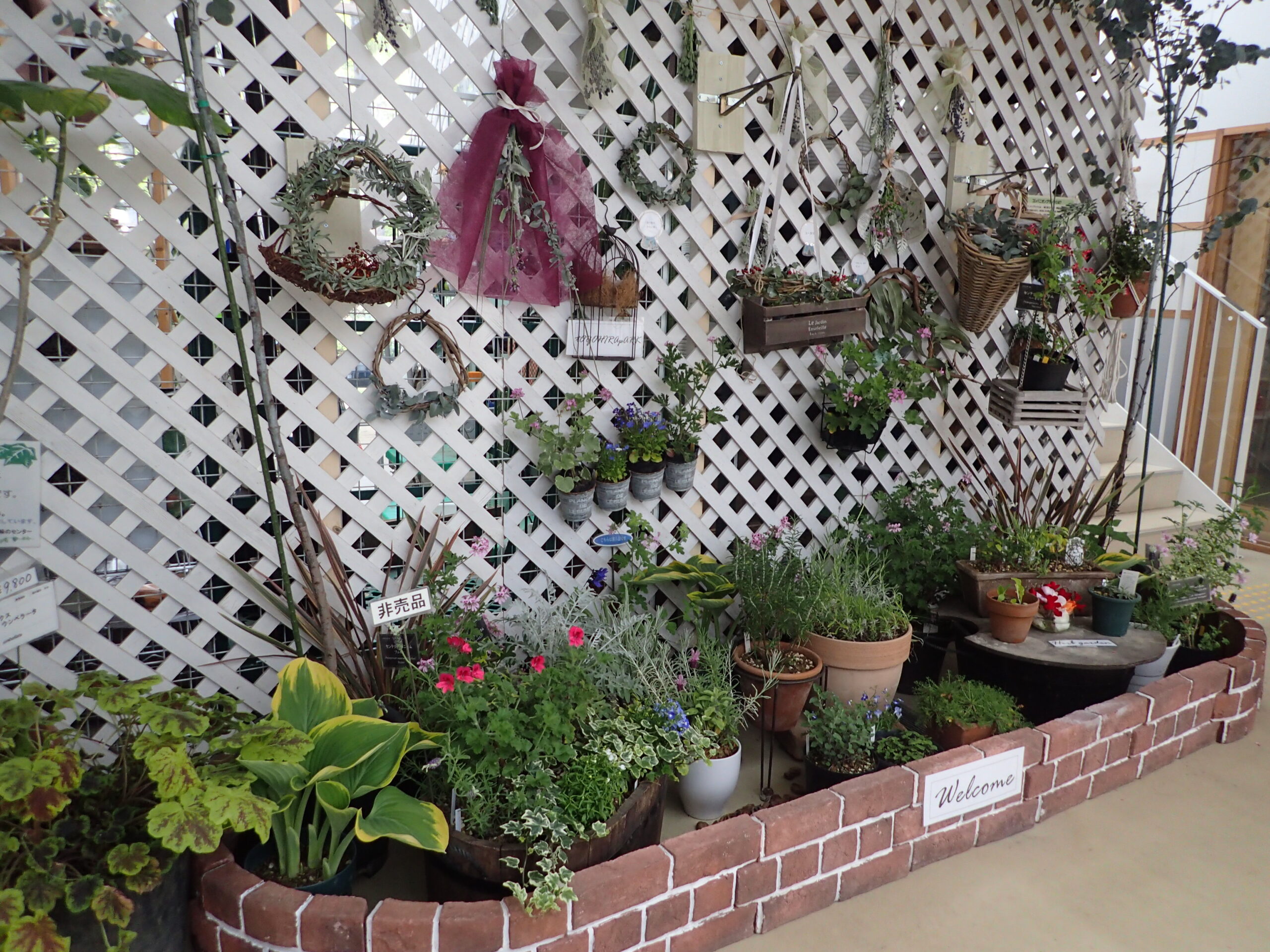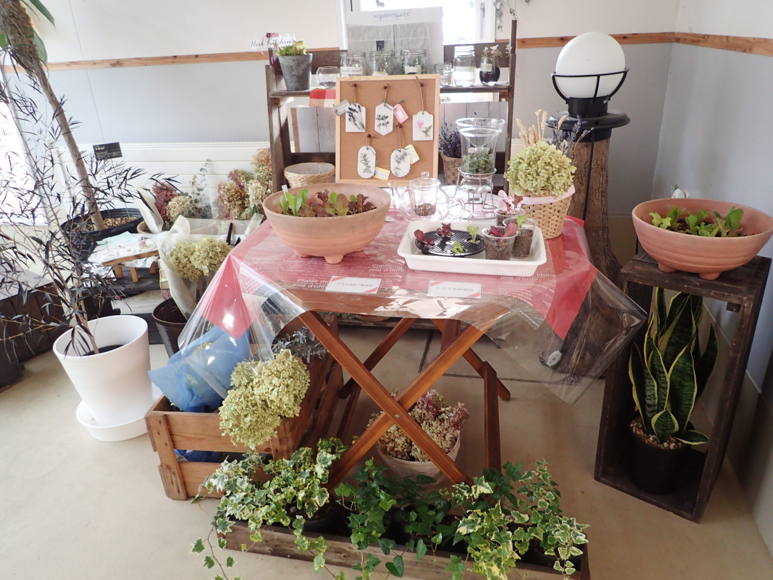 上の写真はハーブを使ったワックスバーや、リーフレタスの水耕栽培やプランターでの栽培見本を置いているコーナーです。