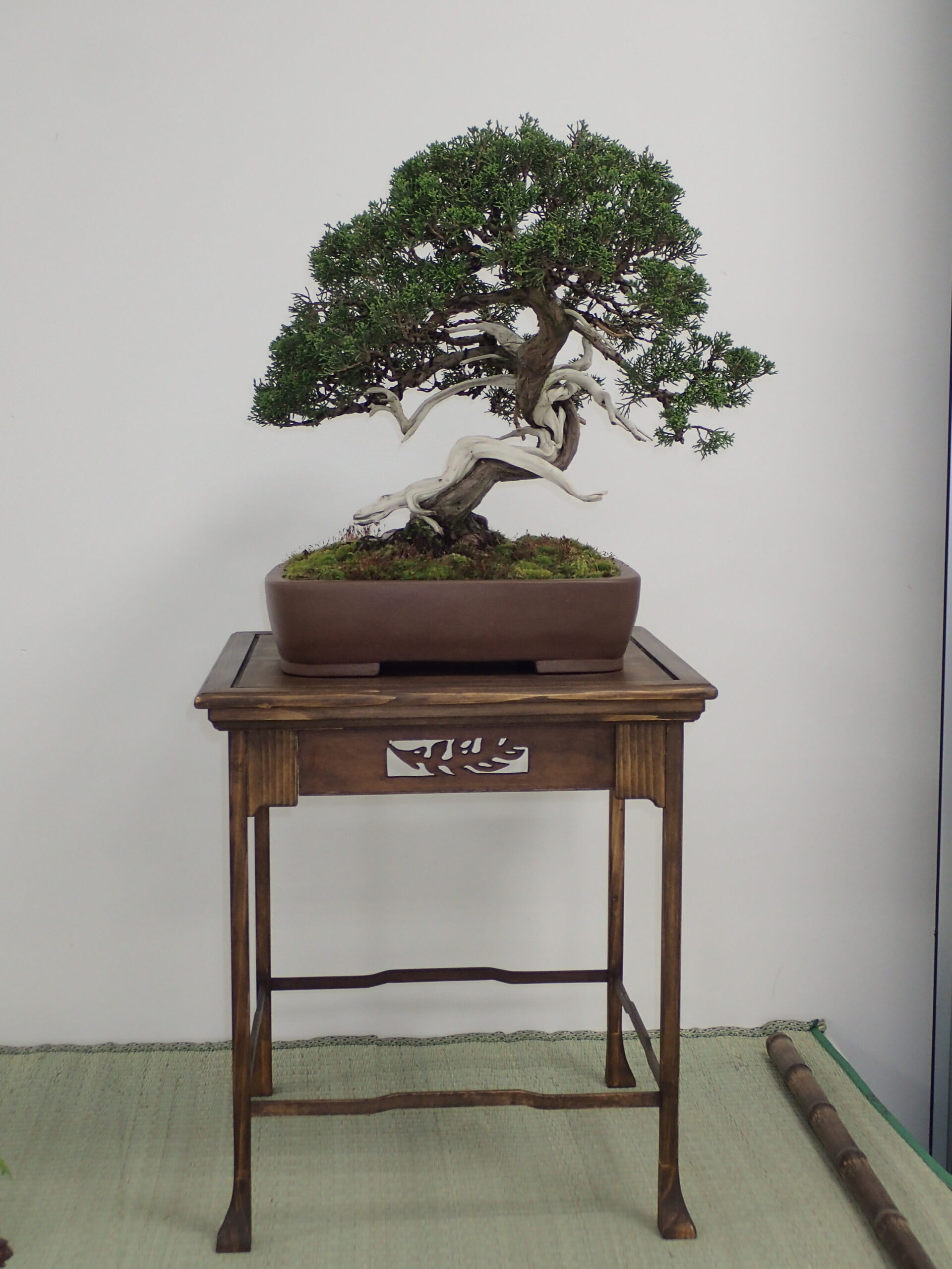 左側はアカエゾマツの大きめの盆栽が主の席で、長寿梅とヒメシャガが添えられた席です。