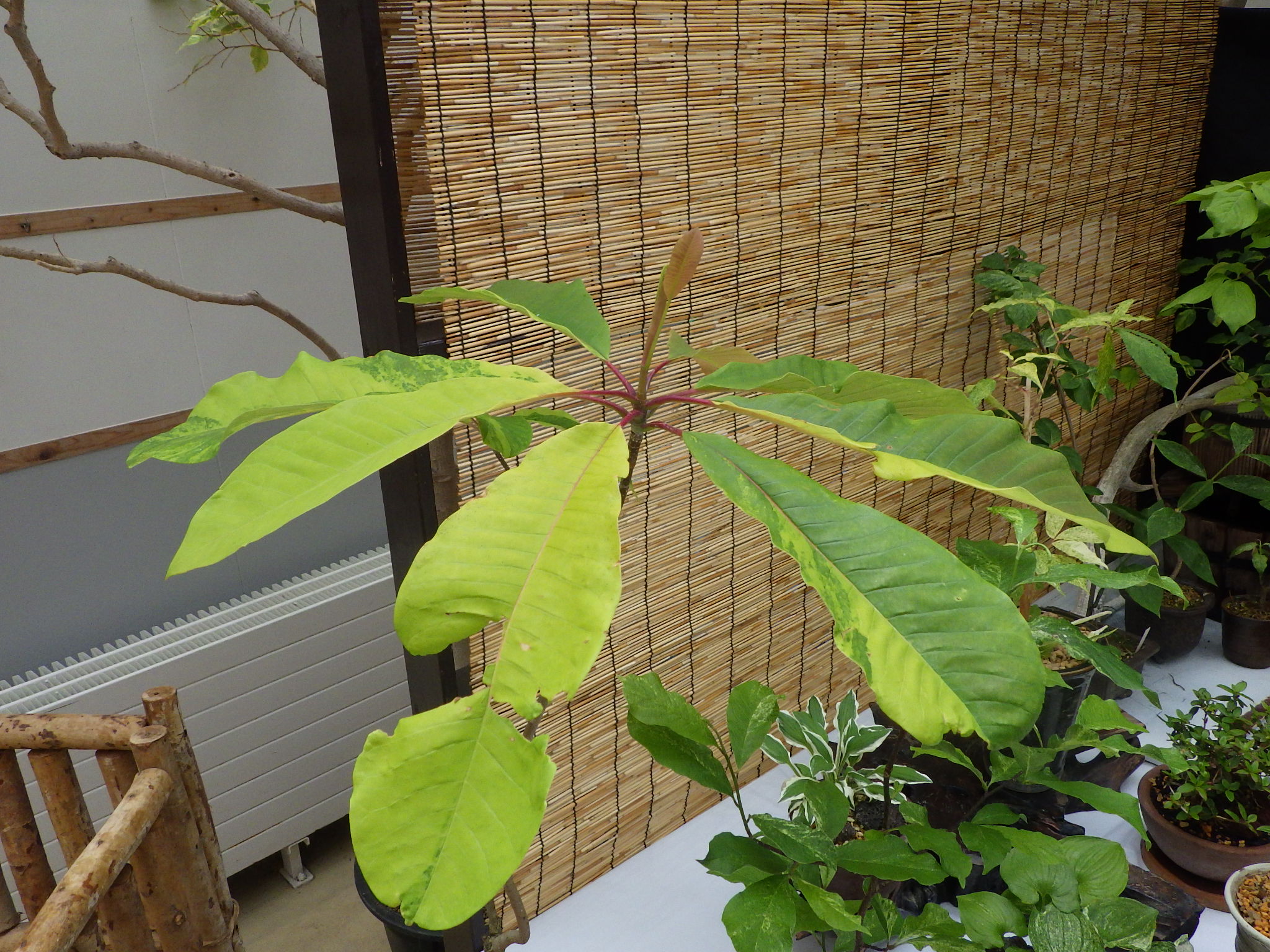 上の写真のように、斑入り植物は本来ある緑色の色素が欠けたり不足した所に黄色や白の模様が入り、葉っぱだけでも観賞価値の高い植物です。