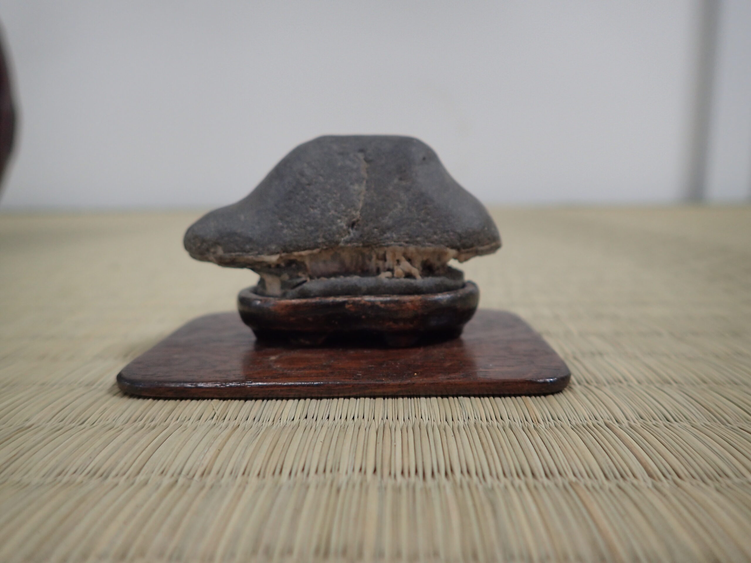 他の席でも多摩川石などの水石が飾られていて、岩山や河原など石のある風景に使うようですが、上の写真の水石は形が面白く家の形をしています。