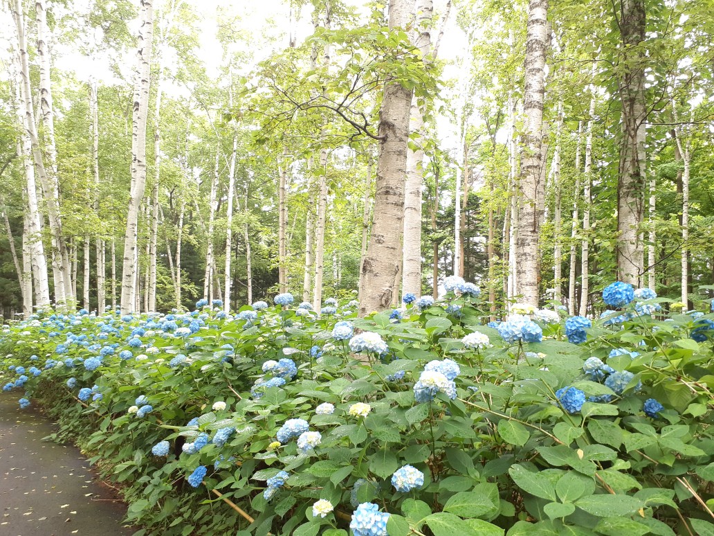 上の写真は7月4日のお昼前のシラカバ林とその外周のアジサイの様子。