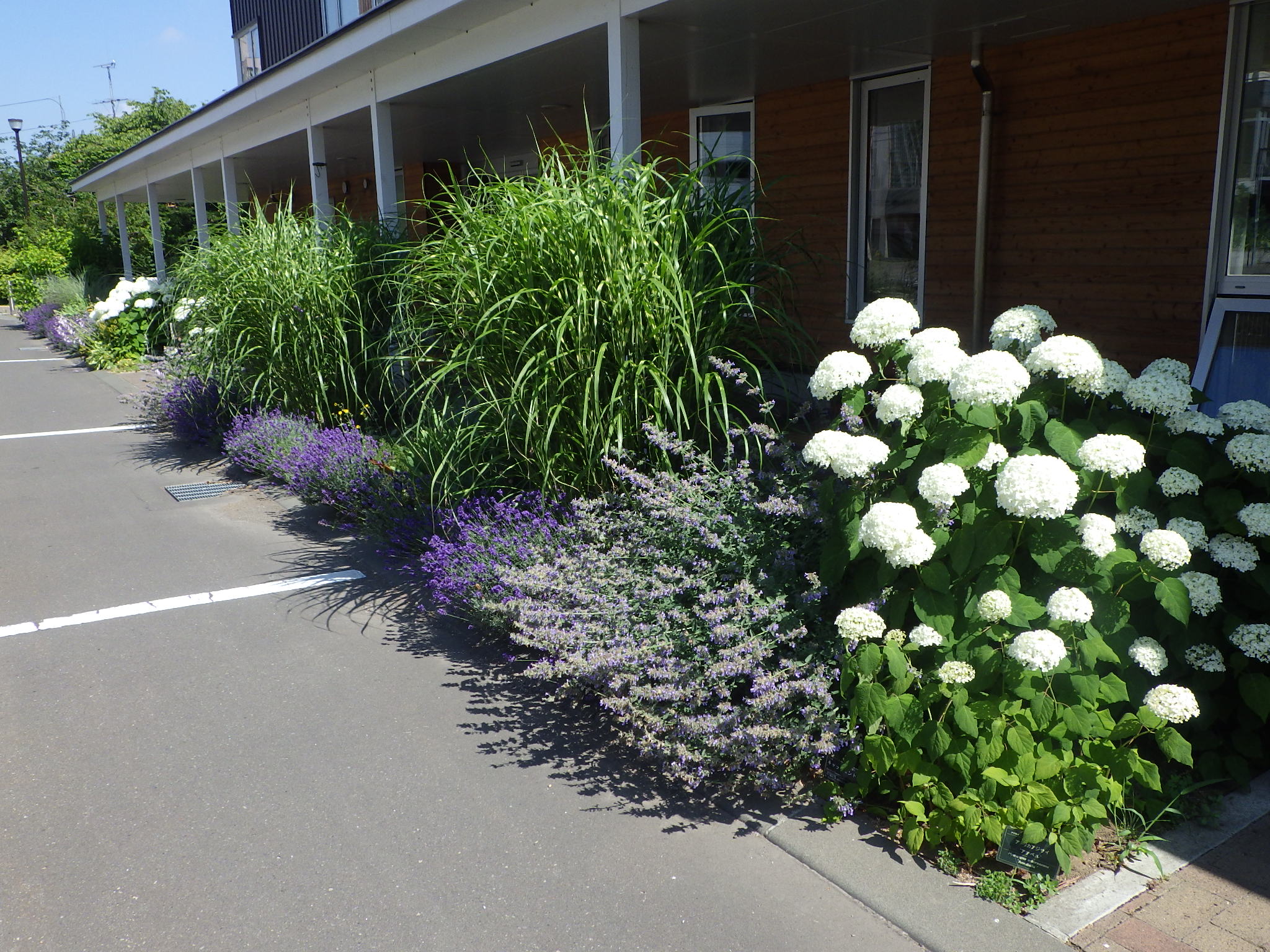 上の写真はセンター前の車寄せ花壇。アナベルとラベンダーやキャットミントの色の対比が美しいですが、宿根草が植えられた花壇なので、間にエキナセアなども咲いています。