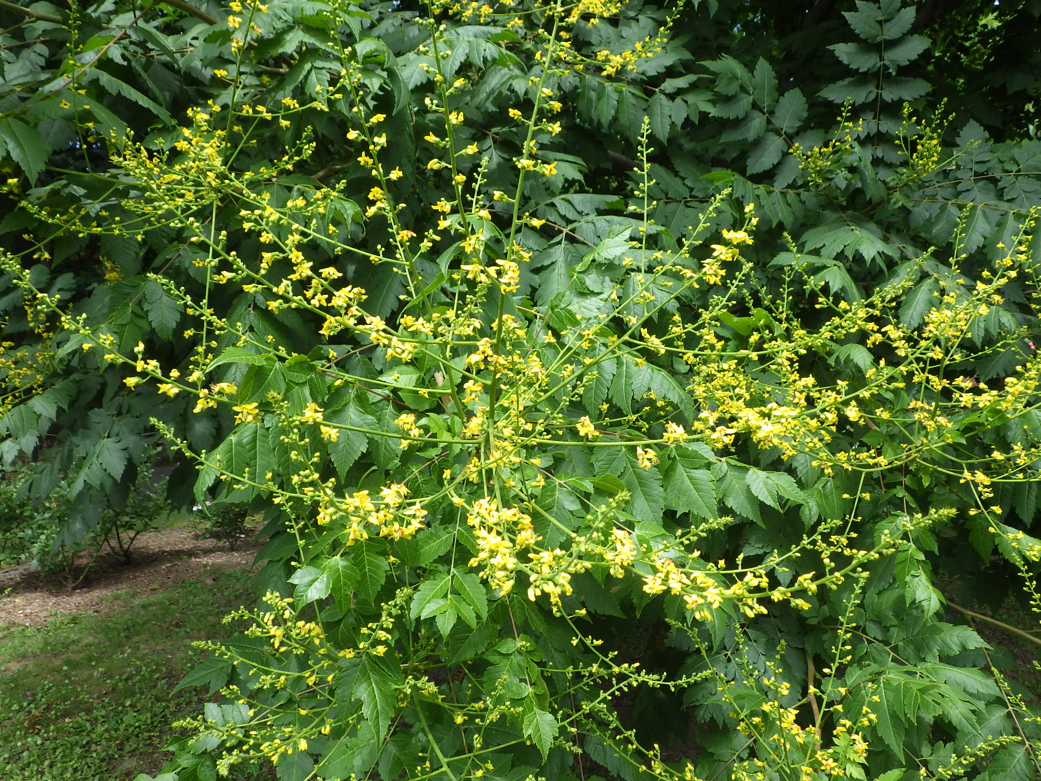 花木園では細かな黄色と赤い花がたくさん咲く花木、モクゲンジも開花が始まりました。