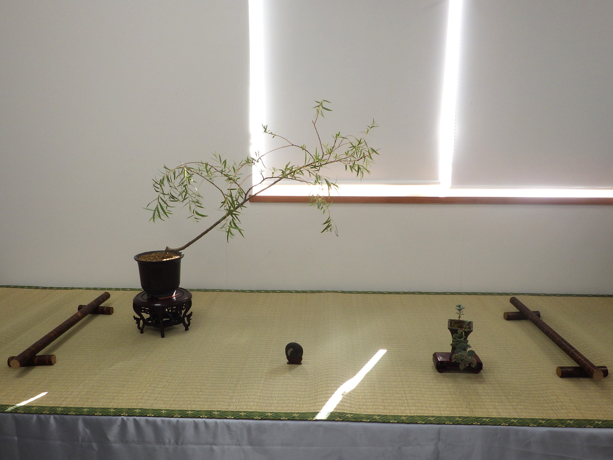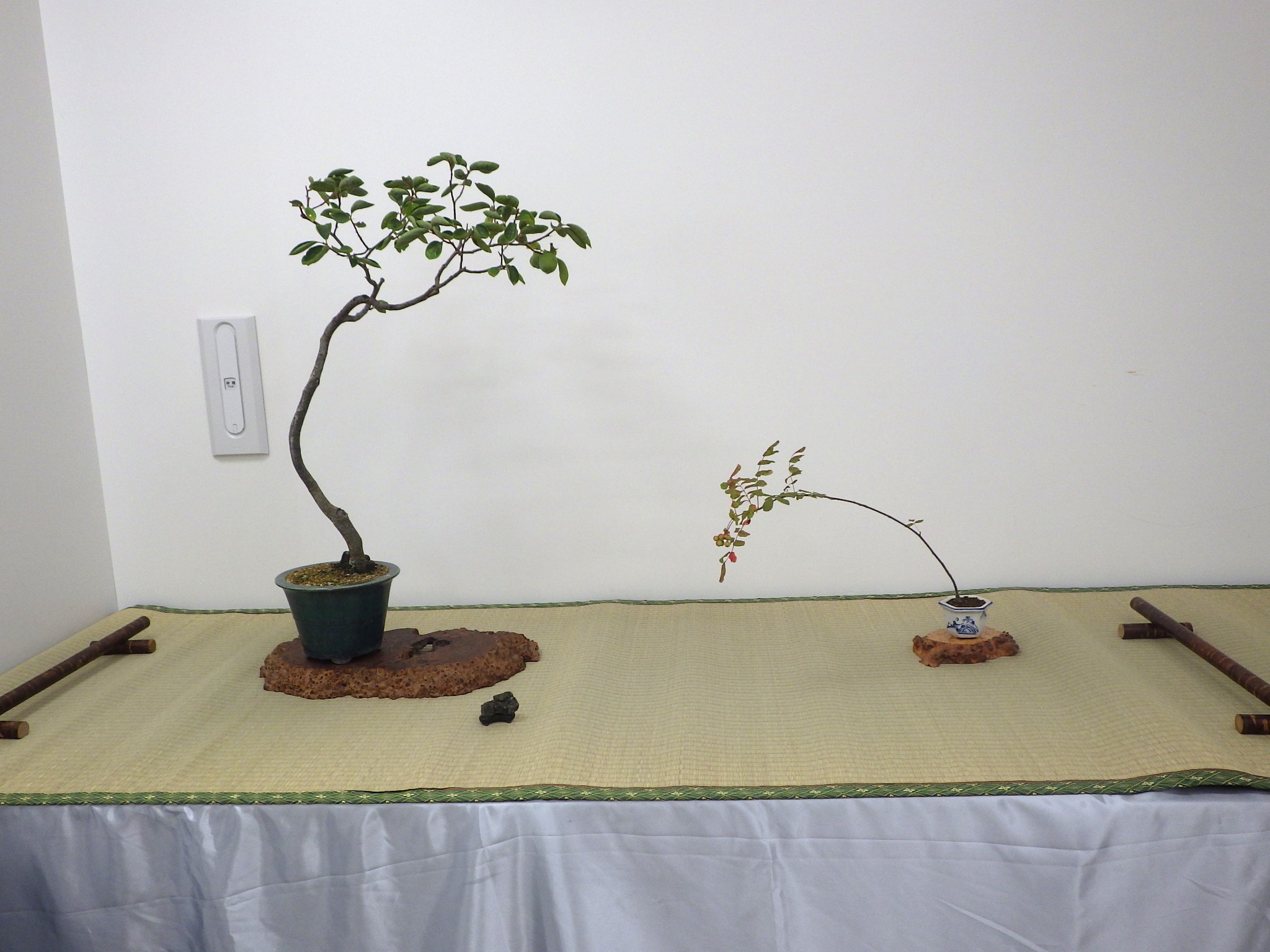 上の写真は左からロッカクドウヤナギ(ロッカクヤナギ)の盆栽、鴨川石、右が花が咲いたミセバヤの盆栽の席です。