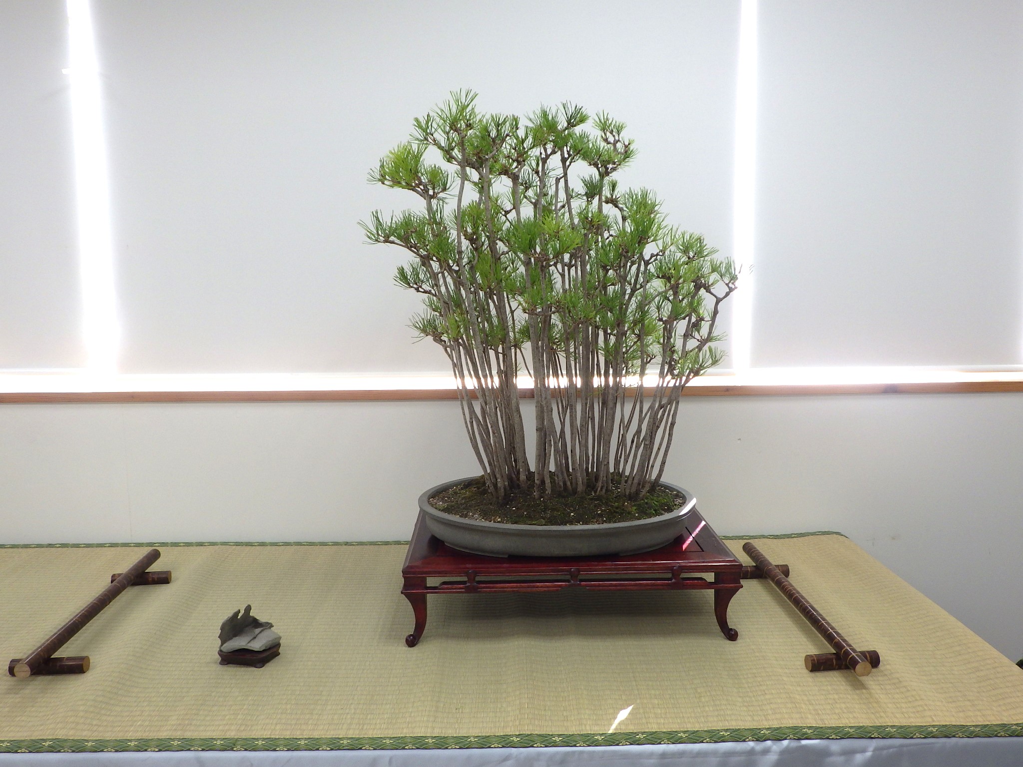 その左手に小さな水石があるのですが、平たい形の石に板状の石がくっついたような形で削られてできた水石で、イメージはスタジアムだそうです。板状の形の方がスタジアムの屋根のようで、野球観戦するスタジアムの横にアカマツ林がある情景を醸しています。
