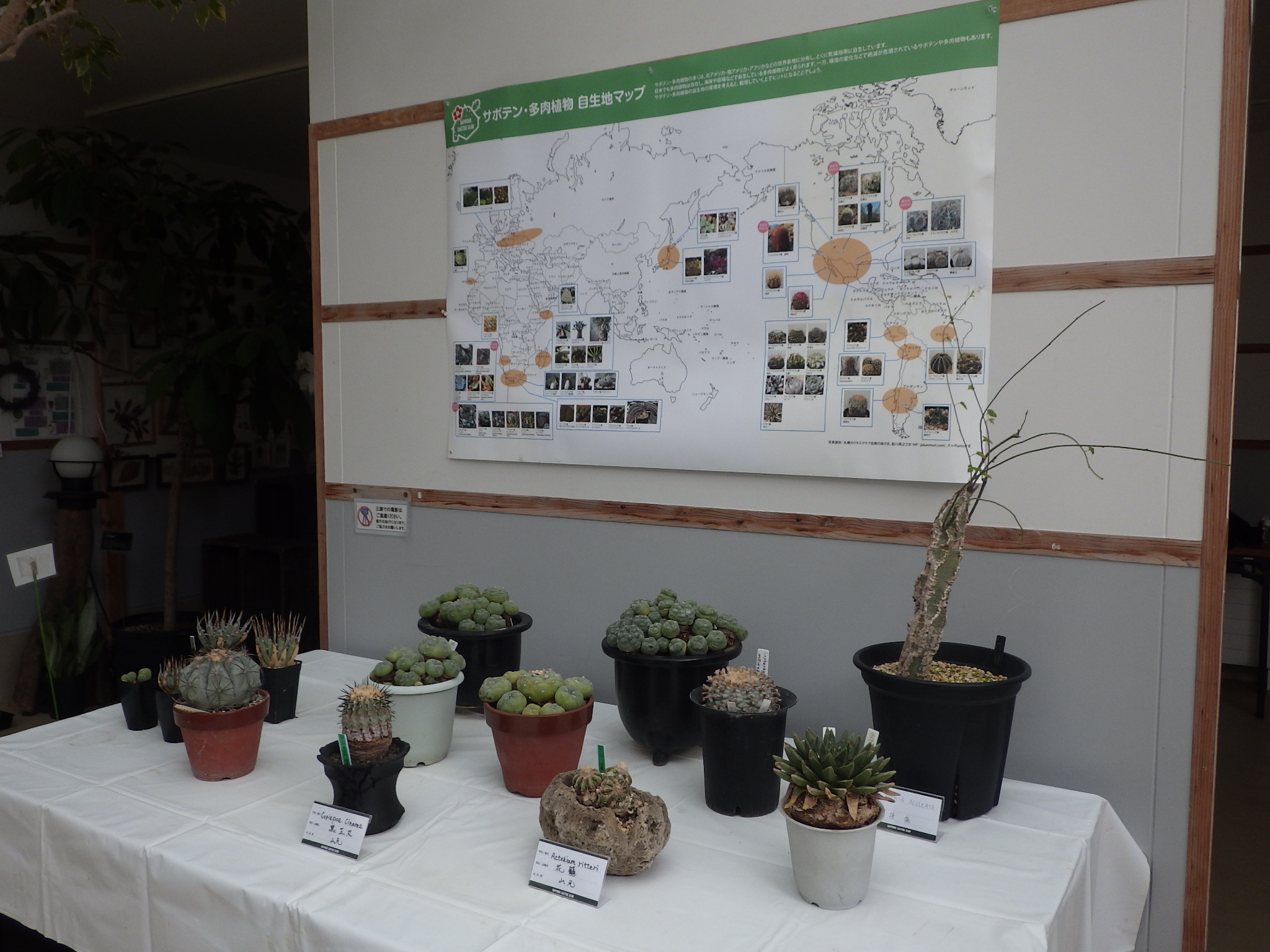 サボテン、多肉植物、塊根植物の産地を記し写真を入れた地図とともに現物の鉢も併せてみていただくコーナーです。