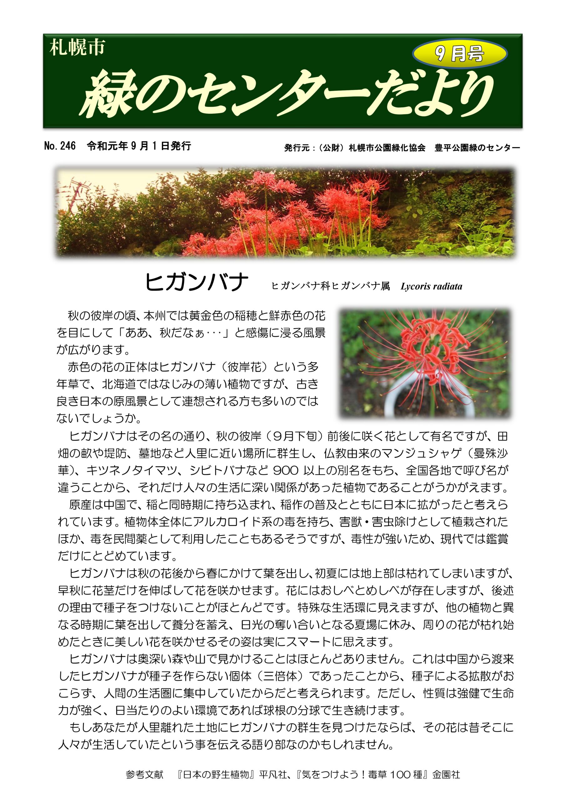 「ヒガンバナ」については、2019年(令和元年)9月発行の緑のセンターだより第246号にも掲載しています。ぜひこちらも参考にしてみてください。
