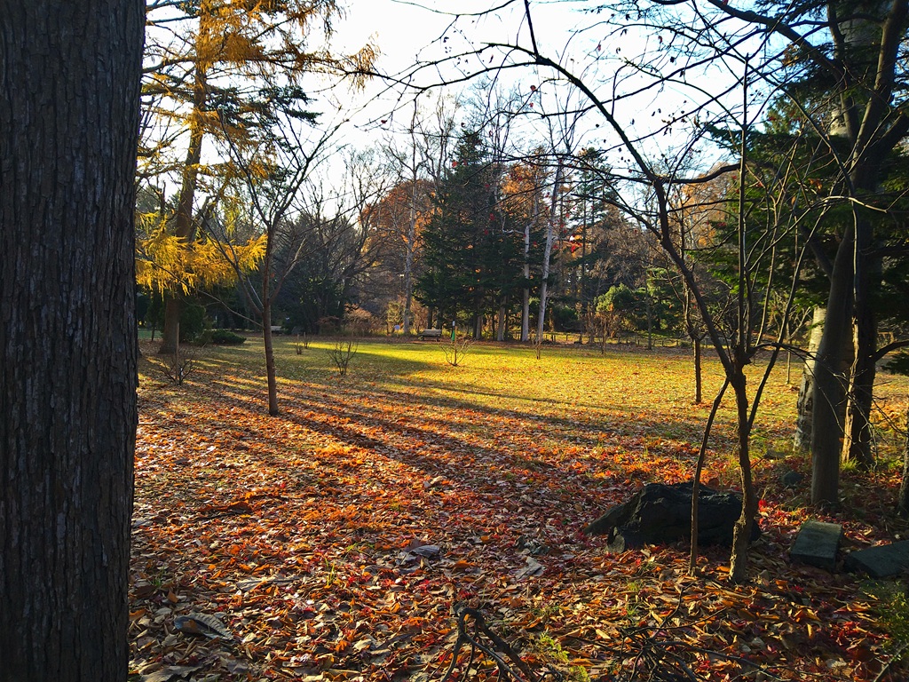 周りの木々の葉が落ちて、芝生をキャンパスに絵を描いたようです。